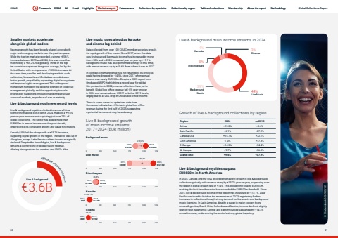 Page titleStandfirstBodyLive & background growth of main income streams 2017%u20132024 (EUR million)Background musicDiscothequesLive musicKaraokeCinema0 250 500 750 1000 12502017,%u20ac803M2024,%u20ac1213M+50.9%0 250 500 750 1000 12502017,%u20ac905M2024,%u20ac1083M+19.6%0 250 500 750 1000 12502017,%u20ac6M2024,%u20ac112M+1881.5%0 250 500 750 1000 12502017,%u20ac218M2024,%u20ac233M+6.8%0 250 500 750 1000 12502024,%u20ac84M2017,%u20ac99M-14.5%Smaller markets accelerate alongside global leadersRevenue growth has been broadly shared across both major and emerging markets over the past ten years. While the top ten markets recorded a strong +65.6% increase between 2015 and 2024, this was more than matched by a +65.2% rise globally. Three of the top ten countries surpassed the global average, led by the United States with an impressive +103.6% increase. At the same time, smaller and developing markets such as Ukraine, Venezuela and Zimbabwe recorded even faster growth, propelled by expanding digital ecosystems and improved rights management. This widespread momentum highlights the growing strength of collective management globally, and the opportunity to scale progress by supporting innovation and infrastructure across all markets, regardless of size or maturity.Live & background reach new record levelsLive & background royalties climbed to a new all-time high to finish above EUR3.5bn in 2024, marking a +9.6% year-on-year increase and capturing just over 25% of global collections. The sector has added more than EUR900m in annual income over the past decade, underscoring its consistent growth and value for creators.Canada/USA led the charge with a +15.7% increase, outpacing digital growth in the region. The sector was up in all regions, except Latin America where income marginally declined. Despite the rise of digital, live & background remains a cornerstone of global royalty revenue, offering strong returns for creators and CMOs alike.Live music races ahead as karaoke and cinema lag behindData collected from over 100 CISAC member societies reveals the rapid growth of live music. Since 2017, when this data was first sourced, live music income has increased by more than +50% and in 2024 increased year-on-year by +15.1%. Background music has also performed strongly in this time, with annual revenue up by +19.6% from where it was in 2017.In contrast, cinema revenue has not returned to its previous peak, having dropped by -14.5% since 2017 when annual income was nearly EUR100m. Despite a 2025 report from Omdia and WIPO highlighting a record year for global film production in 2024, cinema collections have yet to benefit. Global box office revenue fell -8% year-on-year in 2024 and remained over USD11bn below 2019 levels, largely due to a -24% drop in China%u2019s box office income.There is some cause for optimism: data from Comscore indicated an +8% rise in global box office revenue during the first half of 2025, suggesting a potential turnaround may be underway.Live & background royalties surpass EUR500m in North AmericaIn 2024, Canada and the USA recorded the fastest growth in live & background collections globally, with revenue rising by +15.7% year-on-year, surpassing even the region%u2019s digital growth rate of +14%. This brought the total to EUR537m, marking the first time the sector has exceeded the EUR500m threshold. Since 2015, live & background income in the region has increased by +72.1%. AsiaPacific continued to build on the momentum of 2023, registering further increases in collections through strong demand for live events and background music licensing. In Latin America, despite a surge in major concert tours across Argentina, Brazil, Chile, Colombia and Mexico, income declined slightly year-on-year. Meanwhile, Central and Eastern Europe saw a healthy +14.3% annual increase, underscoring the sector%u2019s strong global trajectory.25% share of globalcollectionLive & background s%u20ac3.6BLive & background main income streams in 20243%Cinema 39%Background Music 44%Live Music 8%Discotheques 4%Karaoke Region 2024 vs 2015Africa +13.8% +8.4%Asia-Pacific +6.1% +27.2%Canada/Usa +15.7% +72.1%Latin America -1.0% +17.3%E. Europe +14.3% +34.4%W. Europe +9.7% +36.5%Grand Total +9.6% +37.9%Growth of live & background collections by region%u00a9 Shutterstock 2454926109CISAC Forewords CISAC AI Fraud Highlights Market analysis Futuresource Collections by repertoire Collections by region Tables of collections Membership About the report Methodology20 21Forewords CISAC AI Fraud Highlights Market analysis Futuresource Collections by repertoire Collections by region Tables of collections Membership About the report Methodology Global Collections Report