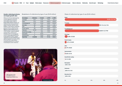 Page titleStandfirstBodySmaller collecting territories see largest growth ratesWhile none of the ten fastest growing countries appeared in the top 30, many smaller revenue territories saw excellent results in 2024. In Europe, T%u00fcrkiye, Slovenia, Ukraine and Uzbekistan were the top performers despite combined collections below EUR60m. In Latin America, Guatemala grew by +56.3% as collections from digital more than doubled, and in El Salvador, growth in all sectors drove a +73.6% increase. In Africa, broadcast revenues led to a +55.9% rise in Zimbabwe whilst live & background income in Kenya approached EUR1m to drive growth of +59.5%. Guinea%u2019s collections more than doubled due to a significant payment for private copying. In the Asia-Pacific region, Macau increased revenues by +51.3% due to its booming live concert collections.Use category Collections % Growth vs 2015 vs 2020TV & Radio 3,417 +1.2% +2.3% +5.1%Digital 5,014 +10.8% +596.2% +109.0%Live & Background 3,379 +10.4% +39.9% +126.9%CD & Video 353 -7.0% -37.7% +1.3%Other 86 +32.8% +43.6% +105.6%Private Copying 266 -4.3% +43.8% -17.7%Publication 0.01 M 0.0% -99.9% -99.8%Rental/Public Lending 8 -5.8% -72.2% -37.1%Reprography 3 +62.9% +47.9%Synchronisation 61 +18.4% +87.7% +131.6%Grand Total %u20ac12,587M +7.2% +71.2% +59.4%Breakdown of collections by type of use (EUR million) Share of collections by type of use (EUR million)0% 10% 20% 30% 40%DigitalLive & BackgroundPrivate CopyingSynchronisationReprographyTV & RadioCD & VideoOtherRental/Public LendingPublicationEducational Use39.8% %u20ac5,014M 27.1% %u20ac3,417M 2.8% %u20ac353M 0.7% %u20ac86M 0.1% %u20ac8M 0.0% %u20ac0.01M 26.8% %u20ac3,379M 2.1% %u20ac266M 0.5% %u20ac61M 0.0% %u20ac3M 0.0% %u20ac0M %u00a9 Hermann DoubouyouCISBY performs at the 2024 REMA festival in Ouagadougou, Burkina Faso.CISAC Forewords CISAC AI Fraud Highlights Market analysis Futuresource Collections by repertoire Collections by region Tables of collections Membership About the report Methodology34 35Forewords CISAC AI Fraud Highlights Market analysis Futuresource Collections by repertoire Collections by region Tables of collections Membership About the report Methodology Global Collections Report