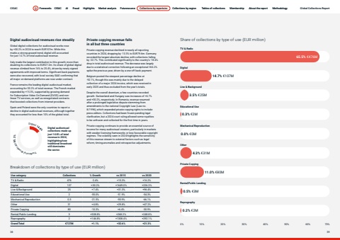 Page titleStandfirstBodyDigital audiovisual revenues rise steadilyGlobal digital collections for audiovisual works rose by +30.2% in 2024 to reach EUR107m. While this marks a strong upward trend, digital still accounted for just 14.7% of total audiovisual revenue.Italy made the largest contribution to this growth, more than doubling its collections to EUR27.2m. Its share of global digital revenue climbed from 16% to 25.4%, driven by newly signed agreements with improved terms. Significant back payments were also recovered, with local society SIAE confirming that all major on-demand platforms are now under contract.France remains the leading digital audiovisual market, accounting for 53.2% of total revenue. The French market expanded by +15.3%, supported by growing demand for Subscription Video On Demand (SVOD) and nonlinear TV services, as well as renegotiated contracts that boosted collections from internet providers.Spain and Poland were the only countries to report a decline in digital audiovisual revenues, although together they accounted for less than 10% of the global total.Private copying revenue falls in all but three countriesPrivate copying revenue declined in nearly all reporting countries in 2024, dropping by -10.3% to EUR79.6m. Germany recorded the largest absolute decline, with collections falling by -22.7%. This contributed significantly to the country%u2019s -18.4% drop in total audiovisual revenue. The decrease was largely due to a statistical correction following an exceptional +66.2% spike the previous year, driven by a one-off back payment.Belgium posted the steepest percentage decline at -92.1%, though this was mainly due to the delayed collection of a major 2024 invoice, which was received in early 2025 and thus excluded from the year%u2019s totals.Despite the overall downturn, a few countries recorded growth. Switzerland and Hungary saw increases of +6.7% and +30.2%, respectively. In Romania, revenue resumed after a prolonged legislative dispute stemming from amendments to the national Copyright Law (Law no. 8/1996), which expanded private copying rights to include press editors. Collections had been frozen pending legal clarification, but a 2024 court ruling allowed some royalties to be unfrozen and collected for the first time in years.Private copying continues to provide an essential source of income for many audiovisual creators, particularly in markets with weaker licensing frameworks or less favourable copyright regimes. The volatility seen in 2024 highlights the sensitivity of this revenue stream to external factors such as legal reform, timing anomalies and retrospective adjustments.Share of collections by type of use (EUR million)0% 10% 20% 30% 40% 50% 60% 70%TV & RadioLive & BackgroundMechanical ReproductionPrivate CopyingReprographyDigitalEducational UseOtherRental/Public LendingBreakdown of collections by type of use (EUR million)Use category Collections % Growth vs 2015 vs 2020TV & Radio 476 -2.4% +15.3% +16.2%Digital 107 +30.2% +1649.0% +226.3%Live & Background 25 +7.4% +31.3% +96.4%Educational Use 2 -55.0% -51.9% -54.3%Mechanical Reproduction 0.3 -21.5% -93.9% -66.1%Other 31 +4.8% +29.8% +47.2%Private Copying 80 -10.3% +6.4% -30.9%Rental/Public Lending 3 +508.8% +268.2% +248.8%Reprography 2 +146.8% +1308.4% +292.1%Grand Total %u20ac727M +1.1% +32.6% +21.3%Digital audiovisual collections made up just 14.8% of total revenue in 2024, highlighting how traditional broadcast still dominates Tthe sector.dar anoiti Bloradcast 85.2%Digital 14.8%65.5% %u20ac476M 14.7% %u20ac107M 3.5% %u20ac25M 0.3% %u20ac2M 0.0% %u20ac0M 4.3% %u20ac31M 11.0% %u20ac80M 0.5% %u20ac3M 0.2% %u20ac2M CISAC Forewords CISAC AI Fraud Highlights Market analysis Futuresource Collections by repertoire Collections by region Tables of collections Membership About the report Methodology38 39Forewords CISAC AI Fraud Highlights Market analysis Futuresource Collections by repertoire Collections by region Tables of collections Membership About the report Methodology Global Collections Report