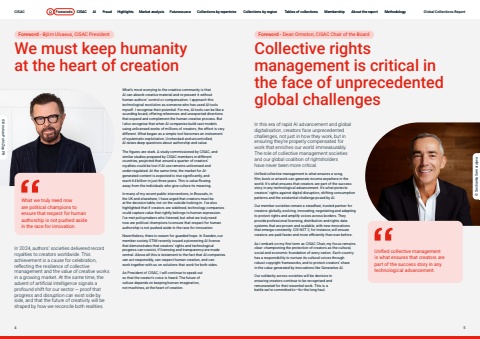 Page titleStandfirstBodyWe must keep humanity at the heart of creationCollective rights management is critical in the face of unprecedented global challenges In 2024, authors%u2019 societies delivered record royalties to creators worldwide. This achievement is a cause for celebration, reflecting the resilience of collective management and the value of creative works in a growing market. At the same time, the advent of artificial intelligence signals a profound shift for our sector %u2014 proof that progress and disruption can exist side by side, and that the future of creativity will be shaped by how we reconcile both realities. In this era of rapid AI advancement and global digitalisation, creators face unprecedented challenges, not just in how they work, but in ensuring they%u2019re properly compensated for work that enriches our world immeasurably. The role of collective management societies and our global coalition of rightsholders have never been more critical. Unified collective management is what ensures a song, film, book or artwork can generate income anywhere in the world. It%u2019s what ensures that creators are part of the success story in any technological advancement. It%u2019s what protects creators%u2019 rights against digital disruption, shifting consumption patterns and the existential challenge posed by AI. Our member societies remain a steadfast, trusted partner for creators globally, evolving, innovating, negotiating and adapting to protect rights and amplify voices across borders. They provide professional licensing, distribution and rights data systems that are proven and scalable, with new innovations that emerge constantly. CIS-NET 2, for instance, will ensure creators are paid faster and more efficiently than ever before. As I embark on my first term as CISAC Chair, my focus remains clear: championing the protection of creators as the cultural, social and economic foundation of every nation. Each country has a responsibility to nurture its cultural voices through robust copyright frameworks, and to protect creators%u2019 share in the value generated by innovations like Generative AI. Our solidarity across societies will be decisive in ensuring creators continue to be recognised and remunerated for their essential work. This is a battle we%u2019re committed to%u2014for the long haul. What%u2019s most worrying to the creative community is that AI can absorb creative material and re-present it without human authors%u2019 control or compensation. I approach this technological revolution as someone who has used AI tools myself. I recognise their potential. For me, AI tools can be like a sounding board, offering references and unexpected directions that expand and complement the human creative process. But I also recognise that when AI companies build vast models using unlicensed works of millions of creators, the effect is very different. What began as a simple tool becomes an instrument of systematic exploitation. Unchecked and uncontrolled, AI raises deep questions about authorship and value. The figures are stark. A study commissioned by CISAC, and similar studies prepared by CISAC members in different countries, projected that around a quarter of creators%u2019 royalties could be lost if AI use remains unlicensed and under-regulated. At the same time, the market for AIgenerated content is expected to rise significantly, and reach 64 billion in just three years. This is value flowing away from the individuals who give culture its meaning. In many of my recent public interventions, in Brussels, in the UK and elsewhere, I have urged that creators must be at the decision table, not on the outside looking in. I%u2019ve also highlighted that if creators are sidelined, technology companies could capture value that rightly belongs to human expression. I%u2019ve met policymakers who listened, but what we truly need now are political champions to ensure that respect for human authorship is not pushed aside in the race for innovation. Nevertheless, there is reason for guarded hope. In Sweden, our member society STIM recently issued a pioneering AI licence that demonstrates that creators%u2019 rights and technological progress can coexist, if licensing and transparency are made central. Above all this is testament to the fact that AI companies can act responsibly, can respect human creation, and can work together with us on solutions that work for both sides. As President of CISAC, I will continue to speak out so that the creator%u2019s voice is heard. The future of culture depends on keeping human imagination, not machines, at the heart of creation. Foreword - Bj%u00f6rn Ulvaeus, CISAC President Foreword - Dean Ormston, CISAC Chair of the BoardWhat we truly need now are political champions to ensure that respect for human authorship is not pushed aside in the race for innovation.Unified collective management is what ensures that creators are part of the success story in any technological advancement.%u00a9 Kristian Pohl/Zap PR%u00a9 Seshanka SamarajiwaCISAC Forewords CISAC AI Fraud Highlights Market analysis Futuresource Collections by repertoire Collections by region Tables of collections Membership About the report Methodology4 5Forewords CISAC AI Fraud Highlights Market analysis Futuresource Collections by repertoire Collections by region Tables of collections Membership About the report Methodology Global Collections Report