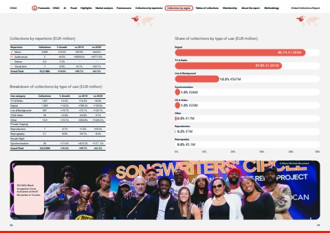 Page titleStandfirstBodyRepertoire Collections % Growth vs 2015 vs 2020Music 3,509 +10.0% +99.9% +64.8%Audiovisual 2 +0.0% +2608.4% +4777.0%Drama 0.2 -7.2% - -Visual Arts 7 -4.9% +3.1% +24.7%Grand Total %u20ac3,518M +10.0% +99.7% +61.5%Collections by repertoire (EUR million)Use category Collections % Growth vs 2015 vs 2020TV & Radio 1,301 +2.6% +14.5% +8.4%Digital 1,585 +14.0% +708.2% +130.8%Live & Background 537 +15.7% +72.1% +120.7%CD & Video 35 +2.8% -64.8% -9.7%Other 16.9 +15.1% +525.8% +1625.2%Private CopyingReproduction 7 -4.7% +7.0% +25.0%Reprography 0.1 -8.8% -29.7% -8.3%Resale RightSynchronisation 36 +71.6% +413.2% +1211.2%Grand Total %u20ac3,518M +10.0% +99.7% +61.5%Breakdown of collections by type of use (EUR million)Share of collections by type of use (EUR million)0% 10% 20% 30% 40% 50%DigitalLive & BackgroundCD & VideoReproductionReprographyTV & RadioSynchronisationOther45.1% %u20ac1,585M 37.0% %u20ac1,301M 15.3% %u20ac537M 1.0% %u20ac36M 1.0% %u20ac35M 0.5% %u20ac17M 0.2% %u20ac7M 0.0% %u20ac0.1M %u00a9 Marie Michele BouchardSOCAN%u2019s Black Songwriter Circle took place at the El Mocambo in Toronto. CISAC Forewords CISAC AI Fraud Highlights Market analysis Futuresource Collections by repertoire Collections by region Tables of collections Membership About the report Methodology58 59Forewords CISAC AI Fraud Highlights Market analysis Futuresource Collections by repertoire Collections by region Tables of collections Membership About the report Methodology Global Collections Report