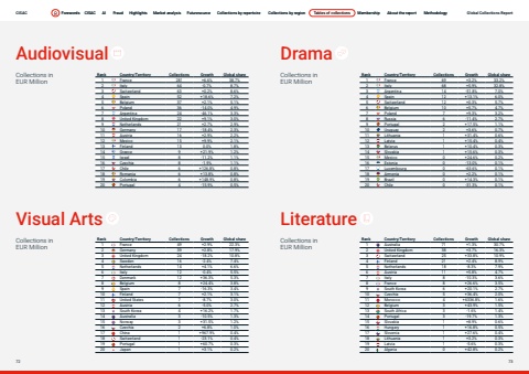Page titleStandfirstBodyCollections in EUR MillionCollections in EUR MillionAudiovisual DramaCollections in EUR MillionCollections in EUR MillionVisual Arts LiteratureRank Country/Territory Collections Growth Global share1 France 281 +6.6% 38.7%2 Italy 64 -0.7% 8.7%3 Switzerland 63 +0.2% 8.6%4 Spain 52 +18.6% 7.2%5 Belgium 37 +2.1% 5.1%6 Poland 36 -14.0% 4.9%7 Argentina 24 -46.1% 3.3%8 United Kingdom 22 +9.1% 3.0%9 Netherlands 21 +2.7% 2.9%10 Germany 17 -18.4% 2.3%11 Austria 16 +2.9% 2.2%12 Mexico 15 +9.9% 2.1%13 Finland 13 0.0% 1.8%14 Greece 9 +21.9% 1.2%15 Israel 8 -11.2% 1.1%16 Czechia 8 -1.9% 1.1%17 Chile 6 +126.8% 0.8%18 Romania 6 +13.8% 0.8%19 Colombia 6 +148.9% 0.8%20 Portugal 4 -15.9% 0.5%Rank Country/Territory Collections Growth Global share1 France 49 +2.9% 22.3%2 Germany 39 +2.8% 17.9%3 United Kingdom 24 -18.2% 10.8%4 Sweden 16 -2.4% 7.4%5 Netherlands 14 +4.1% 6.6%6 Italy 12 -0.4% 5.5%7 Denmark 12 +36.3% 5.3%8 Belgium 8 +24.4% 3.8%9 Spain 7 -16.3% 3.4%10 Finland 7 +2.1% 3.1%11 United States 7 -8.7% 3.0%12 Austria 6 -5.0% 2.7%13 South Korea 4 +16.2% 1.7%14 Australia 3 -10.5% 1.3%15 Norway 3 +31.5% 1.2%16 Czechia 2 +6.8% 1.0%17 China 1 +967.9% 0.4%18 Switzerland 1 -23.1% 0.4%19 Portugal 1 +60.7% 0.3%20 Japan 1 +3.1% 0.2%Rank Country/Territory Collections Growth Global share1 France 69 +3.2% 33.2%2 Italy 68 +5.9% 32.8%3 Argentina 14 -51.8% 7.0%4 Spain 12 +13.1% 6.0%5 Switzerland 12 +0.3% 5.7%6 Belgium 10 +5.7% 4.7%7 Poland 7 +9.3% 3.2%8 Russia 6 -11.4% 2.7%9 Portugal 2 +17.5% 1.1%10 Uruguay 2 +3.6% 0.7%11 Lithuania 1 +31.4% 0.6%12 Latvia 1 +15.4% 0.4%13 Belarus 1 +10.4% 0.3%14 Slovakia 1 +15.6% 0.3%15 Mexico 0 +24.6% 0.2%16 Estonia 0 -13.0% 0.1%17 Luxembourg 0 -63.6% 0.1%18 Armenia 0 +2.2% 0.1%19 Brazil 0 +14.3% 0.1%20 Chile 0 -31.3% 0.1%Rank Country/Territory Collections Growth Global share1 Australia 71 +1.3% 30.7%2 United Kingdom 38 +3.7% 16.3%3 Switzerland 25 +33.8% 10.9%4 Finland 21 +2.4% 8.9%5 Netherlands 18 -8.3% 7.9%6 Austria 11 +5.8% 4.7%7 Italy 8 -10.3% 3.6%8 France 8 +26.6% 3.5%9 South Korea 6 +20.1% 2.7%10 Czechia 5 +36.4% 2.0%11 Morocco 4 +6336.8% 1.6%12 Belgium 3 +43.9% 1.5%13 South Africa 3 -1.6% 1.4%14 Portugal 3 -19.7% 1.3%15 Slovakia 1 +8.9% 0.6%16 Hungary 1 +16.8% 0.5%17 Slovenia 1 +27.6% 0.4%18 Lithuania 1 +3.2% 0.3%19 Latvia 1 -5.6% 0.3%20 Algeria 0 +42.8% 0.2%CISAC Forewords CISAC AI Fraud Highlights Market analysis Futuresource Collections by repertoire Collections by region Tables of collections Membership About the report Methodology72 73Forewords CISAC AI Fraud Highlights Market analysis Futuresource Collections by repertoire Collections by region Tables of collections Membership About the report Methodology Global Collections Report