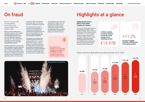 Page titleStandfirstBodyOn fraudFraud in musical works and registrations is one of the most serious threats facing creators today. Bad actors exploit weaknesses in registration systems to claim royalties for works they did not create, or to invent fake titles that divert income away from legitimate songwriters and composers. Left unchecked, this activity harms creators financially and undermines trust in the global royalty distribution system.Fraudulent registrations can take many forms. Individuals may claim ownership of existing works or register fictitious titles in order to siphon royalties. With the rise of AI-generated content and the vast volume of registrations flowing into societies, the risk of fraudulent claims slipping through the cracks has grown. In response, CISAC has prepared a network-wide Know Your Customerand Know Your Repertoire framework. The initiative provides member societies with clear guidelines for verifying repertoire registrations, validating both interested parties and works, sharing intelligence across societies, and taking specific steps when anomalies are identified.The strength of this framework lies in CISAC%u2019s global reach. With 228 member societies in 111 countries, representing more than 5 million creators, we enable the exchange of knowledge, alerts and best practices across borders. By setting common standards and coordinating intelligence, the framework strengthens the ability of societies to protect royalties and ensure they reach the rightful creators.Highlights at a glanceFraud targeting musical works and registrations is complex, but it can be tackled with collective action, transparency and global resolve. CISAC and its member societies are leading that effort, ensuring that the value of music stays where it belongs, in the hands of creators.By setting common standards and coordinating intelligence, the framework strengthens the ability of societies to protect royalties and ensure they reach the rightful creators.Digital growth powers EUR13.97bn global royalties for creatorsOver the past decade, global collections have grown by two-thirds. In 2024, royalties earned by creators around the world rose by +6.6%, reaching a record EUR13.97bn. A +11.2% rise in digital revenues was the primary driver, as subscriber numbers and new contract negotiations continued to expand. The live & background sector also saw a healthy increase, narrowing the gap with TV & radio, which returned to modest growth during the year. Global collections (EUR billion) and annual growth 2015%u201320242015 2020 2021 2022 2023 2024%u20ac8.46B%u20ac9.53B%u20ac13.11B%u20ac9.01B%u20ac12.16B%u20ac13.97B-10.6%decline27.6%growth5.8%growth7.8%growth6.6%growth+11.2%increase in digital revenues, driving most of the global growth.In 2024, royalties earned by creators around the world rose by +6.6%, reaching a record %u20ac13.97B%u00a9 Francofolies de La Rochelle 2024CISAC Forewords CISAC AI Fraud Highlights Market analysis Futuresource Collections by repertoire Collections by region Tables of collections Membership About the report Methodology10 11Forewords CISAC AI Fraud Highlights Market analysis Futuresource Collections by repertoire Collections by region Tables of collections Membership About the report Methodology Global Collections Report