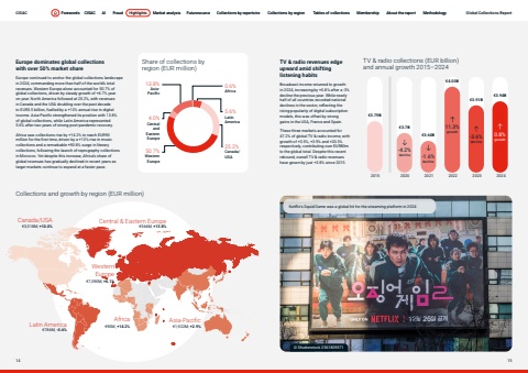Page titleStandfirstBodyEurope dominates global collections with over 50% market shareEurope continued to anchor the global collections landscape in 2024, commanding more than half of the world%u2019s total revenues. Western Europe alone accounted for 50.7% of global collections, driven by steady growth of +6.7% year on year. North America followed at 25.2%, with revenues in Canada and the USA doubling over the past decade to EUR3.5 billion, fuelled by a +10% annual rise in digital income. Asia-Pacific strengthened its position with 13.8% of global collections, while Latin America represented 5.6% after two years of strong post-pandemic recovery. Africa saw collections rise by +14.2% to reach EUR90 million for the first time, driven by a +10% rise in music collections and a remarkable +90.8% surge in literary collections, following the launch of reprography collections in Morocco. Yet despite this increase, Africa%u2019s share of global revenues has gradually declined in recent years as larger markets continue to expand at a faster pace.TV & radio revenues edge upward amid shifting listening habitsBroadcast income returned to growth in 2024, increasing by +0.8% after a -3% decline the previous year. While nearly half of all countries recorded national declines in the sector, reflecting the rising popularity of digital subscription models, this was offset by strong gains in the USA, France and Spain.These three markets accounted for 47.2% of global TV & radio income, with growth of +3.5%, +3.9% and +20.3% respectively, contributing over EUR80m to the global total. Despite this recent rebound, overall TV & radio revenues have grown by just +3.8% since 2015.Collections and growth by region (EUR million)5.6%Latin America0.6%Africa50.7%Western Europe25.2%Canada/USA4.0%Central and Eastern Europe13.8%AsiaPacificShare of collections by region (EUR million)2015 2020 2021 2022 2023 2024%u20ac3.79B%u20ac3.64B%u20ac3.91B%u20ac3.7B%u20ac4.05B%u20ac3.94B-4.2%decline11.3%growth-1.6%decline-3.6%decline0.8%growthTV & radio collections (EUR billion) and annual growth 2015%u20132024%u00a9 Shutterstock 2561809571 Netflix%u2019s Squid Game was a global hit for the streaming platform in 2024Western Europe%u20ac7,090M, +6.1%Canada/USA%u20ac3,518M, +10.0%Latin America%u20ac786M, -0.6%Africa%u20ac90M, +14.2%Asia-Pacific%u20ac1,922M, +2.9%Central & Eastern Europe %u20ac566M, +13.8%CISAC Forewords CISAC AI Fraud Highlights Market analysis Futuresource Collections by repertoire Collections by region Tables of collections Membership About the report Methodology14 15Forewords CISAC AI Fraud Highlights Market analysis Futuresource Collections by repertoire Collections by region Tables of collections Membership About the report Methodology Global Collections Report