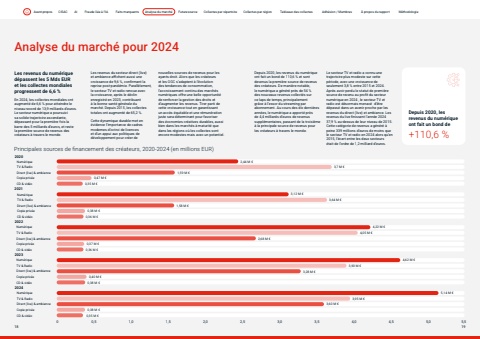 Page titleStandfirstBodyDepuis 2020, les revenus du num%u00e9rique ont fait un bond de+110,6 %Analyse du march%u00e9 pour 2024 Les revenus du num%u00e9rique d%u00e9passent les 5 Mds EUR et les collectes mondiales progressent de 6,6 % En 2024, les collectes mondiales ont augment%u00e9 de 6,6 % pour atteindre le niveau record de 13,9 milliards d%u2019euros. Le secteur num%u00e9rique a poursuivi sa solide trajectoire ascendante, d%u00e9passant pour la premi%u00e8re fois la barre des 5 milliards d%u2019euros, et reste la premi%u00e8re source de revenus des cr%u00e9ateurs %u00e0 travers le monde. Les revenus du secteur direct (live) et ambiance affichent aussi une croissance de 9,6 %, confirmant la reprise post-pand%u00e9mie. Parall%u00e8lement, le secteur TV et radio renoue avec la croissance, apr%u00e8s le d%u00e9clin enregistr%u00e9 en 2023, contribuant %u00e0 la bonne sant%u00e9 g%u00e9n%u00e9rale du march%u00e9. Depuis 2015, les collectes totales ont augment%u00e9 de 65,2 %. Cette dynamique durable met en %u00e9vidence l%u2019importance de cadres modernes d%u2019octroi de licences et d%u2019un appui aux politiques de d%u00e9veloppement pour cr%u00e9er de nouvelles sources de revenus pour les ayants droit. Alors que les cr%u00e9ateurs et les OGC s%u2019adaptent %u00e0 l%u2019%u00e9volution des tendances de consommation, l%u2019accroissement continu des march%u00e9s num%u00e9riques offre une belle opportunit%u00e9 de renforcer la gestion des droits et d%u2019augmenter les revenus. Tirer parti de cette croissance tout en garantissant un acc%u00e8s %u00e9quitable et une r%u00e9mun%u00e9ration juste sera d%u00e9terminant pour favoriser des %u00e9conomies cr%u00e9atives durables, aussi bien dans les march%u00e9s %u00e0 maturit%u00e9 que dans les r%u00e9gions o%u00f9 les collectes sont encore modestes mais avec un potentiel. Principales sources de financement des cr%u00e9ateurs, 2020-2024 (en millions EUR)0 0,5 1,0 1,5 2,0 2,5 3,0 3,5 4,0 4,5 5,0 5,520202021202320222024Num%u00e9riqueTV & Radio Direct (live) & ambiance Copie priv%u00e9e CD & vid%u00e9o Num%u00e9riqueTV & Radio Direct (live) & ambiance Copie priv%u00e9e CD & vid%u00e9o Num%u00e9riqueTV & Radio Direct (live) & ambiance Copie priv%u00e9e CD & vid%u00e9o Num%u00e9riqueTV & Radio Direct (live) & ambiance Copie priv%u00e9e CD & vid%u00e9o Num%u00e9riqueTV & Radio Direct (live) & ambiance Copie priv%u00e9e CD & vid%u00e9o 2,44 M %u20ac3,7 M %u20ac1,59 M %u20ac0,47 M %u20ac0,35 M %u20ac3,12 M %u20ac3,64 M %u20ac1,58 M %u20ac0,38 M %u20ac0,36 M %u20ac4,22 M %u20ac4,05 M %u20ac2,68 M %u20ac0,37 M %u20ac0,36 M %u20ac4,62 M %u20ac3,90 M %u20ac3,28 M %u20ac0,40 M %u20ac0,38 M %u20ac5,14 M %u20ac3,95 M %u20ac3,60 M %u20ac0,38 M %u20ac 0,35 M %u20acDepuis 2020, les revenus du num%u00e9rique ont fait un bond de 110,6 % et sont devenus la premi%u00e8re source de revenus des cr%u00e9ateurs. De mani%u00e8re notable, le num%u00e9rique a g%u00e9n%u00e9r%u00e9 pr%u00e8s de 54 % des nouveaux revenus collect%u00e9s sur ce laps de temps, principalement gr%u00e2ce %u00e0 l%u2019essor du streaming par abonnement. Au cours des dix derni%u00e8res ann%u00e9es, le num%u00e9rique a apport%u00e9 pr%u00e8s de 4,4 milliards d%u2019euros de revenus suppl%u00e9mentaires, passant de la troisi%u00e8me %u00e0 la principale source de revenus pour les cr%u00e9ateurs %u00e0 travers le monde. Le secteur TV et radio a connu une trajectoire plus modeste sur cette p%u00e9riode, avec une croissance de seulement 3,8 % entre 2015 et 2024. Apr%u00e8s avoir perdu le statut de premi%u00e8re source de revenu au profit du secteur num%u00e9rique en 2024 , le secteur TV et radio est d%u00e9sormais menac%u00e9 d%u2019%u00eatre d%u00e9pass%u00e9 dans un avenir proche par les revenus du direct (live) et ambiance. Les revenus du live finissent l%u2019ann%u00e9e 2024 37,9 % au-dessus de leur niveau de 2015. Cette cat%u00e9gorie de revenus a g%u00e9n%u00e9r%u00e9 %u00e0 peine 339 millions d%u2019euros de moins que le secteur TV et radio en 2024 alors qu%u2019en 2015, l%u2019%u00e9cart entre les deux secteurs %u00e9tait de l%u2019ordre de 1,2 milliard d%u2019euros.18 19Avant-propos CISAC AI Fraude li%u00e9e %u00e0 l%u2019IA Faits marquants Analyse du march%u00e9 Futuresource Collectes par r%u00e9pertoire Collectes par r%u00e9gion Tableaux des collectes Adh%u00e9sion / Membres %u00c0 propos du rapport M%u00e9thodologie