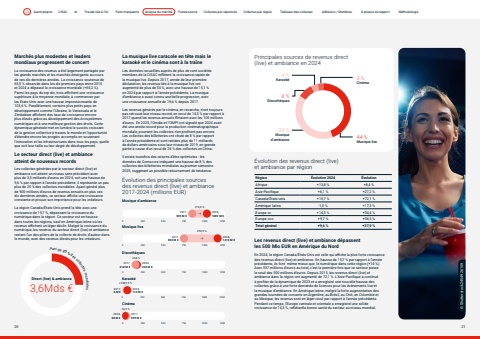 Page titleStandfirstBody%u00c9volution des principales sources des revenus direct (live) et ambiance 2017-2024 (millions EUR) Musique d%u2019ambianceDiscoth%u00e8quesMusique liveKaraok%u00e9Cin%u00e9ma 0 250 500 750 1000 12502017,803 M %u20ac2024,1213 M %u20ac+50,9 %0 250 500 750 1000 12502017,905 M %u20ac2024,1083 M %u20ac+19,6 %0 250 500 750 1000 12502017,6 M %u20ac2024,112 M %u20ac+1881,5 % 0 250 500 750 1000 12502017,218 M %u20ac2024,233 M %u20ac+6,8 %0 250 500 750 1000 12502024,84 M %u20ac2017,%u20ac99 M %u20ac-14,5 %March%u00e9s plus modestes et leaders mondiaux progressent de concert La croissance des revenus a %u00e9t%u00e9 largement partag%u00e9e par les grands march%u00e9s et les march%u00e9s %u00e9mergents au cours de ces dix derni%u00e8res ann%u00e9es. La croissance soutenue de 65,5 % observ%u00e9e dans les dix premiers pays entre 2015 et 2024 a d%u00e9pass%u00e9 la croissance mondiale (+65,2 %). Parmi les pays du top dix, trois affichent une croissance sup%u00e9rieure %u00e0 la moyenne mondiale, %u00e0 commencer par les %u00c9tats-Unis avec une hausse impressionnante de 103,6 %. Parall%u00e8lement, certains plus petits pays en d%u00e9veloppement comme l%u2019Ukraine, le Venezuela et le Zimbabwe affichent des taux de croissance encore plus %u00e9lev%u00e9s gr%u00e2ce au d%u00e9veloppement des %u00e9cosyst%u00e8mes num%u00e9riques et %u00e0 une meilleure gestion des droits. Cette dynamique g%u00e9n%u00e9rale met en lumi%u00e8re le succ%u00e8s croissant de la gestion collective %u00e0 travers le monde et l%u2019opportunit%u00e9 d%u2019%u00e9tendre encore les progr%u00e8s accomplis en soutenant l%u2019innovation et les infrastructures dans tous les pays, quelle que soit leur taille ou leur degr%u00e9 de d%u00e9veloppement. Le secteur direct (live) et ambiance atteint de nouveaux records Les collectes g%u00e9n%u00e9r%u00e9es par le secteur direct (live) et ambiance ont atteint un niveau sans pr%u00e9c%u00e9dent avec plus de 3,5 milliards d%u2019euros en 2024, soit une hausse de 9,6 % par rapport %u00e0 l%u2019ann%u00e9e pr%u00e9c%u00e9dente, il repr%u00e9sente un peu plus de 25 % des collectes mondiales. Ayant g%u00e9n%u00e9r%u00e9 plus de 900 millions d%u2019euros de revenus annuels en plus ces dix derni%u00e8res ann%u00e9es, ce secteur affiche une croissance constante et prouve son importance pour les cr%u00e9ateurs. La r%u00e9gion Canada/%u00c9tats-Unis prend la t%u00eate avec une croissance de 15,7 %, d%u00e9passant la croissance du num%u00e9rique dans la r%u00e9gion. Ce secteur est en hausse dans toutes les r%u00e9gions, sauf en Am%u00e9rique latine o%u00f9 les revenus affichent un l%u00e9ger d%u00e9clin. Malgr%u00e9 la croissance du num%u00e9rique, les revenus du secteur direct (live) et ambiance restent l%u2019un des piliers de la collecte de droits d%u2019auteur dans le monde, avec des revenus %u00e9lev%u00e9s pour les cr%u00e9ateurs.La musique live caracole en t%u00eate mais le karaok%u00e9 et le cin%u00e9ma sont %u00e0 la tra%u00eene Les donn%u00e9es recueillies aupr%u00e8s de plus de cent soci%u00e9t%u00e9s membres de la CISAC refl%u00e8tent la croissance rapide de la musique live. Depuis 2017, ann%u00e9e de leur premi%u00e8re d%u00e9claration, les revenus li%u00e9s %u00e0 la musique live ont augment%u00e9 de plus de 50 %, avec une hausse de 15,1 % en 2024 par rapport %u00e0 l%u2019ann%u00e9e pr%u00e9c%u00e9dente. La musique d%u2019ambiance a aussi connu une belle progression, avec une croissance annuelle de 19,6 % depuis 2017.Les revenus g%u00e9n%u00e9r%u00e9s par le cin%u00e9ma, en revanche, n%u2019ont toujours pas retrouv%u00e9 leur niveau record, en recul de 14,5 % par rapport %u00e0 2017 quand les revenus annuels flirtaient avec les 100 millions d%u2019euros. En 2025, l%u2019Omdia et l%u2019OMPI ont signal%u00e9 que 2024 avait %u00e9t%u00e9 une ann%u00e9e record pour la production cin%u00e9matographique mondiale, pourtant les collectes n%u2019en profitent pas encore. Les collectes des billetteries ont chut%u00e9 de 8 % par rapport %u00e0 l%u2019ann%u00e9e pr%u00e9c%u00e9dente et sont rest%u00e9es plus de 11 milliards de dollars am%u00e9ricains sous leur niveau de 2019, en grande partie %u00e0 cause d%u2019un recul de 24 % des collectes en Chine. Il existe toutefois des raisons d%u2019%u00eatre optimistes : les donn%u00e9es de Comscore indiquent une hausse de 8 % des collectes des billetteries mondiales au premier semestre 2025, sugg%u00e9rant un possible retournement de tendance. Les revenus direct (live) et ambiance d%u00e9passent les 500 Mio EUR en Am%u00e9rique du Nord En 2024, la r%u00e9gion Canada/%u00c9tats-Unis est celle qui affiche la plus forte croissance des revenus direct (live) et ambiance. En hausse de 15,7 % par rapport %u00e0 l%u2019ann%u00e9e pr%u00e9c%u00e9dente, ils font m%u00eame mieux que le num%u00e9rique dans cette r%u00e9gion (+14 %).Avec 537 millions d%u2019euros au total, c%u2019est la premi%u00e8re fois que ce secteur passe le seuil des 500 millions d%u2019euros. Depuis 2015, les revenus direct (live) et ambiance dans la r%u00e9gion ont augment%u00e9 de 72,1 %. L%u2019Asie-Pacifique a continu%u00e9 %u00e0 profiter de la dynamique de 2023 et a enregistr%u00e9 une nouvelle hausse des collectes gr%u00e2ce %u00e0 une forte demande de licences pour les %u00e9v%u00e9nements live et la musique d%u2019ambiance. En Am%u00e9rique latine, malgr%u00e9 la forte augmentation des grandes tourn%u00e9es de concerts en Argentine, au Br%u00e9sil, au Chili, en Colombie et au Mexique, les revenus sont en l%u00e9ger recul par rapport %u00e0 l%u2019ann%u00e9e pr%u00e9c%u00e9dente. Pendant ce temps, l%u2019Europe centrale et orientale a enregistr%u00e9 une solide croissance de 14,3 %, refl%u00e9tantla bonne sant%u00e9 du secteur au niveau mondial. Part de 25 % des collectes mondialesDirect (live) & ambiance 3,6Mds %u20ac Principales sources de revenus direct (live) et ambiance en 2024 3 %Cin%u00e9ma 39 %Musique d%u2019ambiance 44 %Musique live8 %Discoth%u00e8que