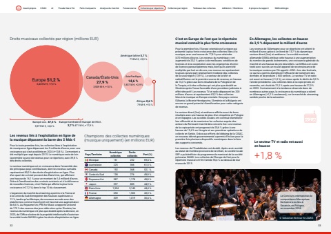 Page titleStandfirstBodyDroits musicaux collect%u00e9s par r%u00e9gion (millions EUR)Canada/%u00c9tats-Unis 27,9 %3,509 M %u20ac, +10 %Asie-Pacifique14,6 %1,837 M %u20ac, +2,9 %Europe 51,2 %6,445 M %u20ac, +7,3 %Am%u00e9rique latine 5,7 %718 M %u20ac, +3,3 %Europe occ. 47,5 %5,975 M %u20ac, +6,6 %Europe Centrale et Europe de l%u2019Est . 3,7 % 471 M %u20ac, +17,9 %Afrique 0,6 %79 M %u20ac, +10 %Les revenus li%u00e9s %u00e0 l%u2019exploitation en ligne de la musique d%u00e9passent la barre des 5 Mds %u20acPour la toute premi%u00e8re fois, les collectes li%u00e9es %u00e0 l%u2019exploitation de musique en ligne d%u00e9passent les 5 milliards d%u2019euros, avec une croissance qui s%u2019est acc%u00e9l%u00e9r%u00e9e en 2024 (+10,8 %). Ce montant a %u00e9t%u00e9 multipli%u00e9 par sept depuis 2015. Le num%u00e9rique reste de loin la premi%u00e8re source de revenus pour ce r%u00e9pertoire, avec 39,8 % des droits collect%u00e9s.Le secteur num%u00e9rique est en croissance dans l%u2019ensemble des dix principaux pays contributeurs, dont les revenus cumul%u00e9s repr%u00e9sentent 83,0 % des droits d%u2019exploitation en ligne. Plus d%u2019un quart de ce total provient des %u00c9tats-Unis, qui affichent une hausse de 16,1 % pour un montant de 1,4 milliard d%u2019euros. Gr%u00e2ce %u00e0 l%u2019am%u00e9lioration des contrats existants et %u00e0 la d%u00e9livrance de nouvelles licences, c%u2019est l%u2019Italie qui affiche la plus forte croissance (+27,2 %) dans le top 10 du classement.L%u2019expansion du march%u00e9 du streaming a permis %u00e0 la France et %u00e0 la Cor%u00e9e du Sud d%u2019enregistrer des hausses sup%u00e9rieures %u00e0 12 %, tandis qu%u2019au Mexique, de nouveaux accords avec des plateformes comme Crunchyroll ont favoris%u00e9 une augmentation de 8,4 %. Au Royaume-Uni, PRS for Music a rapport%u00e9 un bond de 179 % des revenus des jeux vid%u00e9o alors qu%u2019en Slov%u00e9nie, les revenus du num%u00e9rique ont plus que doubl%u00e9 apr%u00e8s la d%u00e9cision, en 2023, de l%u2019Office slov%u00e8ne de la propri%u00e9t%u00e9 intellectuelle d%u2019autoriser la soci%u00e9t%u00e9 locale SAZAS %u00e0 g%u00e9rer les droits d%u2019exploitation en ligne.C%u2019est en Europe de l%u2019est que le r%u00e9pertoire musical conna%u00eet la plus forte croissancePour la premi%u00e8re fois, l%u2019Europe orientale est la r%u00e9gion qui pr%u00e9sente la plus forte croissance des collectes li%u00e9es %u00e0 la musique, avec une hausse de 17,8 % pour atteindre |470 millions d%u2019euros. Les revenus du num%u00e9rique y ont augment%u00e9 de 20,2 % gr%u00e2ce %u00e0 de meilleures conditions de licences et %u00e0 la coop%u00e9ration avec les organismes d%u2019octroi de licences paneurop%u00e9ennes mais, bien qu%u2019ils aient %u00e9t%u00e9 multipli%u00e9s par huit en dix ans, ces revenus ne repr%u00e9sentent toujours qu%u2019une part relativement modeste des collectes de la sous-r%u00e9gion (13,9 %). Le secteur de la t%u00e9l%u00e9- et radiodiffusion est la premi%u00e8re source de revenus, en hausse de 16,3 % gr%u00e2ce aux bons r%u00e9sultats de la Pologne et de la Turquie, et %u00e0 des collectes qui ont plus que doubl%u00e9 en Slov%u00e9nie apr%u00e8s l%u2019issue favorable d%u2019une proc%u00e9dure judiciaire %u00e0 effet r%u00e9troactif. Les revenus TV et radio d%u00e9passent les 200 millions d%u2019euros et repr%u00e9sentent 43,2 % des collectes li%u00e9es %u00e0 la musique en Europe orientale. Des pays comme l%u2019Albanie, la Bosnie-Herz%u00e9govine, l%u2019Arm%u00e9nie et la Bulgarie ont encore un grand potentiel d%u2019am%u00e9lioration pour cette cat%u00e9gorie de revenus.Le secteur direct (live) et ambiance affiche aussi de bons r%u00e9sultats avec une hausse de plus d%u2019un cinqui%u00e8me en Pologne et en Espagne. Les soci%u00e9t%u00e9s locales ont continu%u00e9 d%u2019am%u00e9liorer leur efficacit%u00e9 et de maximiser les collectes aupr%u00e8s des acteurs du florissant march%u00e9 des concerts live. Les revenus de la copie priv%u00e9e ont progress%u00e9 de 20,6 % gr%u00e2ce %u00e0 une hausse de 19,4 % en Hongrie et aux premi%u00e8res op%u00e9rations de collecte en Serbie. Gr%u00e2ce aux efforts de lobbying de la CISAC, un nouveau d%u00e9cret gouvernemental a permis d%u2019inclure pour la premi%u00e8re fois plusieurs dispositifs num%u00e9riques dans la liste des supports concern%u00e9s.Les revenus de l%u2019Ouzb%u00e9kistan ont doubl%u00e9. Apr%u00e8s avoir acc%u00e9d%u00e9 au statut de membre provisoire de la CISAC, la soci%u00e9t%u00e9 locale SIIP a pu b%u00e9n%u00e9ficier du programme de mentorat de la soci%u00e9t%u00e9 polonaise ZAIKS. Les collectes de l%u2019Europe de l%u2019est pour le r%u00e9pertoire musical ont fini l%u2019ann%u00e9e 55,4 % au-dessus de leur niveau de 2015.En Allemagne, les collectes en hausse de 3,9 % d%u00e9passent le milliard d%u2019eurosLes revenus de l%u2019Allemagne pour ce r%u00e9pertoire ont atteint le milliard d%u2019euros gr%u00e2ce %u00e0 un bond de 13,7 % du dynamique secteur direct (live) et ambiance. La soci%u00e9t%u00e9 musicale allemande GEMA attribue cette hausse %u00e0 une augmentation du nombre de grands %u00e9v%u00e9nements, une croissance g%u00e9n%u00e9rale du march%u00e9 et une hausse du prix des billets. La GEMA a en outre test%u00e9 avec succ%u00e8s un nouvel appareil de reconnaissance de la musique soutenu par l%u2019IA appel%u00e9 %u00ab KIM %u00bb lors des festivals, ce qui lui a permis d%u2019am%u00e9liorer l%u2019efficacit%u00e9 de traitement des donn%u00e9es et de produire 2 600 setlists. Le secteur TV et radio est aussi en hausse (+1,8 %), un mieux apr%u00e8s le d%u00e9clin de 5,0 % l%u2019ann%u00e9e pr%u00e9c%u00e9dente. Les collectes li%u00e9es %u00e0 la copie priv%u00e9e, en revanche, ont chut%u00e9 de 21,5 % apr%u00e8s une hausse de 27,0 % en 2023. Contrairement %u00e0 la tendance observ%u00e9e dans de nombreux autres pays, la croissance du num%u00e9rique a ralenti en Allemagne (+1,2 % seulement), car le march%u00e9 du streamin