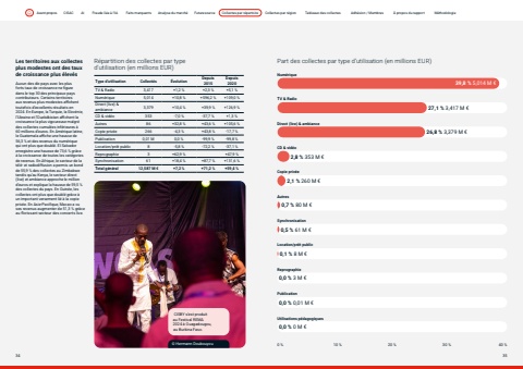 Page titleStandfirstBodyLes territoires aux collectes plus modestes ont des taux de croissance plus %u00e9lev%u00e9sAucun des dix pays avec les plus forts taux de croissance ne figure dans le top 30 des principaux pays contributeurs. Certains territoires aux revenus plus modestes affichent toutefois d%u2019excellents r%u00e9sultats en 2024. En Europe, la Turquie, la Slov%u00e9nie, l%u2019Ukraine et l%u2019Ouzb%u00e9kistan affichent la croissance la plus vigoureuse malgr%u00e9 des collectes cumul%u00e9es inf%u00e9rieures %u00e0 60 millions d%u2019euros. En Am%u00e9rique latine, le Guatemala affiche une hausse de 56,3 % et des revenus du num%u00e9rique qui ont plus que doubl%u00e9. El Salvador enregistre une hausse de 73,6 % gr%u00e2ce %u00e0 la croissance de toutes les cat%u00e9gories de revenus. En Afrique, le secteur de la t%u00e9l%u00e9- et radiodiffusion a permis un bond de 55,9 % des collectes au Zimbabwe tandis qu%u2019au Kenya, le secteur direct (live) et ambiance approche le million d%u2019euros et explique la hausse de 59,5 % des collectes du pays. En Guin%u00e9e, les collectes ont plus que doubl%u00e9 gr%u00e2ce %u00e0 un important versement li%u00e9 %u00e0 la copie priv%u00e9e. En Asie-Pacifique, Macao a vu ses revenus augmenter de 51,3 % gr%u00e2ce au florissant secteur des concerts live. Type d%u2019utilisation Collect%u00e9s %u00c9volution Depuis 2015Depuis 2020TV & Radio 3,417 +1,2 % +2,3 % +5,1 %Num%u00e9rique 5,014 +10,8 % +596,2 % +109,0 %Direct (live) & ambiance 3,379 +10,4 % +39,9 % +126,9 %CD & vid%u00e9o 353 -7,0 % -37,7 % +1,3 %Autres 86 +32,8 % +43,6 % +105,6 %Copie priv%u00e9e 266 -4,3 % +43,8 % -17,7 %Publication 0,01 M 0,0 % -99,9 % -99,8 %Location/pr%u00eat public 8 -5,8 % -72,2 % -37,1 %Reprographie 3 +62,9 % +47,9 %Synchronisation 61 +18,4 % +87,7 % +131,6 %Total g%u00e9n%u00e9ral 12,587 M %u20ac +7,2 % +71,2 % +59,4 %R%u00e9partition des collectes par type d%u2019utilisation (en millions EUR)Part des collectes par type d%u2019utilisation (en millions EUR)0 % 10 % 20 % 30 % 40 %Num%u00e9riqueDirect (live) & ambianceCopie priv%u00e9eSynchronisationReprographieTV & RadioCD & vid%u00e9oAutresLocation/pr%u00eat public PublicationUtilisations p%u00e9dagogiques39,8 % 5,014 M %u20ac27,1 % 3,417 M %u20ac2,8 % 353 M %u20ac0,7 % 80 M %u20ac0,1 % 8 M %u20ac0,0 % 0,01 M %u20ac26,8 % 3,379 M %u20ac2,1 % 260 M %u20ac0,5 % 61 M %u20ac0,0 % 3 M %u20ac0,0 % 0 M %u20ac%u00a9 Hermann DoubouyouCISBY s%u2019est produit au Festival REMA 2024 %u00e0 Ouagadougou, au Burkina Faso.34 35Avant-propos CISAC AI Fraude li%u00e9e %u00e0 l%u2019IA Faits marquants Analyse du march%u00e9 Futuresource Collectes par r%u00e9pertoire Collectes par r%u00e9gion Tableaux des collectes Adh%u00e9sion / Membres %u00c0 propos du rapport M%u00e9thodologie