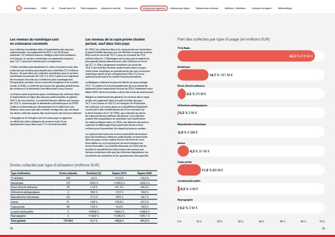 Page titleStandfirstBodyLes revenus du num%u00e9rique sont en croissance constanteLes collectes mondiales li%u00e9es %u00e0 l%u2019exploitation des %u0153uvres audiovisuelles ont augment%u00e9 de 30,2 % en 2024 pour atteindre 107 millions d%u2019euros. Malgr%u00e9 cette forte tendance %u00e0 la hausse, le secteur num%u00e9rique ne repr%u00e9sente toujours que 14,7 % du total collect%u00e9 pour ce r%u00e9pertoire.L%u2019Italie contribue principalement %u00e0 cette croissance avec des collectes qui ont plus que doubl%u00e9 pour atteindre 27,2 millions d%u2019euros. Sa part dans les collectes mondiales pour le secteur num%u00e9rique est pass%u00e9e de 16,0 % %u00e0 25,4 % gr%u00e2ce %u00e0 la signature de nouveaux accords aux conditions plus avantageuses. D%u2019importants arri%u00e9r%u00e9s ont en outre %u00e9t%u00e9 r%u00e9cup%u00e9r%u00e9s et la soci%u00e9t%u00e9 locale, la SIAE, a confirm%u00e9 que toutes les grandes plateformes de contenus %u00e0 la demande sont d%u00e9sormais sous licence.La France reste le premier pays contributeur de collectes li%u00e9es %u00e0 l%u2019exploitation en ligne des %u0153uvres audiovisuelles et g%u00e9n%u00e8re 53,2 % de ces revenus. Le march%u00e9 fran%u00e7ais affiche une hausse de 15,3 %, soutenue par la demande croissante pour la SVOD (vid%u00e9o %u00e0 la demande par abonnement) et la t%u00e9l%u00e9vision non lin%u00e9aire, mais aussi par des contrats ren%u00e9goci%u00e9s, qui ont dop%u00e9 les droits collect%u00e9s aupr%u00e8s des fournisseurs de services Internet.L%u2019Espagne et la Pologne sont les seuls pays %u00e0 rapporter un d%u00e9clin de cette cat%u00e9gorie de revenus mais ils ne repr%u00e9sentent %u00e0 eux deux que 10 % du total mondial.Les revenus de la copie priv%u00e9e chutent partout, sauf dans trois paysEn 2024, les collectes li%u00e9es %u00e0 la copie priv%u00e9e ont chut%u00e9 dans la quasi-totalit%u00e9 des pays qui ont d%u00e9clar%u00e9 ce type de revenus. Elles sont en recul de 10,3 % pour un montant de 79,6 millions d%u2019euros. L%u2019Allemagne est le pays qui enregistre la plus grande baisse absolue avec des collectes en recul de 22,7 %. Elle a largement contribu%u00e9 %u00e0 la chute de 18,4 % du total des revenus audiovisuels dans ce pays. Cette chute s%u2019explique en grande partie par une correction statistique apr%u00e8s un pic exceptionnel (+66,2 %) li%u00e9 au paiement ponctuel d%u2019un arri%u00e9r%u00e9 l%u2019ann%u00e9e pr%u00e9c%u00e9dente.La Belgique a d%u00e9clar%u00e9 le plus fort d%u00e9clin en pourcentage (-92,1 %) m%u00eame s%u2019il est principalement d%u00fb %u00e0 un retard de paiement d%u2019une importante facture de 2024, finalement re%u00e7u d%u00e9but 2025, dont le montant a donc %u00e9t%u00e9 exclu du total annuel.Malgr%u00e9 ce ralentissement g%u00e9n%u00e9ral, les revenus de la copie priv%u00e9e ont augment%u00e9 dans un petit nombre de pays : +6,7 % en Suisse et +30,2 % en Hongrie. En Roumanie, les collectes ont repris apr%u00e8s un long diff%u00e9rend l%u00e9gislatif cons%u00e9cutif %u00e0 des modifications de la loi roumaine sur le droit d%u2019auteur (loi n%u00b0 8/1996), qui a %u00e9tendu les droits de copie priv%u00e9e aux %u00e9diteurs de presse. Les collectes avaient %u00e9t%u00e9 suspendues en attendant une clarification du cadre juridique mais, en 2024, une d%u00e9cision de justice a permis le d%u00e9blocage d%u2019une partie des droits et leur collecte pour la premi%u00e8re fois depuis plusieurs ann%u00e9es.La copie priv%u00e9e reste une source essentielle de revenus pour de nombreux cr%u00e9ateurs audiovisuels, en particulier dans les pays o%u00f9 les cadres d%u2019octroi de licences sont plus faibles ou o%u00f9 la protection du droit d%u2019auteur est moins favorable. La volatilit%u00e9 observ%u00e9e en 2024 met en lumi%u00e8re la sensibilit%u00e9 de cette source de revenus aux facteurs ext%u00e9rieurs tels que les r%u00e9formes l%u00e9gislatives, les anomalies de calendrier et les ajustements r%u00e9trospectifs.Part des collectes par type d%u2019usage (en millions EUR)0 % 10 % 20 % 30 % 40 % 50 % 60 % 70 %TV & RadioDirect (live) & ambianceReproduction m%u00e9caniqueCopie priv%u00e9eReprographieNum%u00e9riqueUtilisations p%u00e9dagogiquesAutresLocation/pr%u00eat public Droits collect%u00e9s par type d%u2019utilisation (millions EUR)Type d%u2019utilisation Droits collect%u00e9s %u00c9volution [%] Depuis 2015 Depuis 2020TV & Radio 476 -2,4 % +15,3 % +16,2 %Num%u00e9rique 107 +30,2 % +1649,0 % +226,3 %Direct (live) & ambiance 25 +7,4 % +31,3 % +96,4 %Utilisations p%u00e9dagogiques 2 -55,0 % -51,9 % -54,3 %Reproduction m%u00e9canique 0,3 -21,5 % -93,9 % -66,1 %Autres 31 +4,8 % +29,8 % +47,2 %Copie priv%u00e9e 80 -10,3 % +6,4 % -30,9 %Location/pr%u00eat public 3 +508,8 % +268,2 % +248,8 %Reprographie 2 +146,8 % +1308,4 % +292,1 %Total g%u00e9n%u00e9ral 727 M %u20ac +1,1 % +32,6 % +21,3 %65,5 % 470 M %u20ac14,7 % 107 M %u20ac3,5 % 25 M %u20ac0,3 % 2 M %u20ac0,0 % %u20ac 0M %u20ac4,3 % 31 M %u20ac11,0 % 80 M %u20ac0,5 % 3 M %u20ac0,2 % 2 M %u20ac38 39Avant-propos CISAC AI Fraude li%u00e9e %u00e0 l%u2019IA Faits marquants Analyse du march%u00e9 Futuresource Collectes par r%u00e9pertoire Collectes par r%u00e9gion Tableaux des collectes Adh%u00e9sion / Membres %u00c0 propos du rapport M%u00e9thodologie