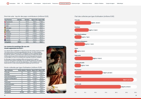 Page titleStandfirstBodyLes revenus du num%u00e9rique li%u00e9s aux arts visuels augmentent de 30,8 %Les collectes li%u00e9es %u00e0 l%u2019exploitation en ligne des %u0153uvres des artistes visuels ont atteint 14,9 millions d%u2019euros et ont plus que quadrupl%u00e9 en dix ans. Ce chiffre s%u2019explique principalement par la hausse de 58,2 % enregistr%u00e9e en France, qui g%u00e9n%u00e8re plus de la moiti%u00e9 des collectes. La nouvelle licence sign%u00e9e entre la soci%u00e9t%u00e9 locale ADAGP et Meta a permis aux artistes visuels de recevoir des droits quand leurs %u0153uvres sont partag%u00e9es en France sur les plateformes du groupe (Facebook, Instagram).En Allemagne, le secteur num%u00e9rique affiche une hausse de 2,6 % apr%u00e8s le lancement de proc%u00e9dures d%u2019arbitrage contre les grandes plateformes de m%u00e9dias sociaux en cas d%u2019%u00e9chec ou de rejet des n%u00e9gociations. L%u2019Italie enregistre aussi une hausse de 43,4 % et des revenus quasiment multipli%u00e9s par neuf en dix ans.Type d%u2019utilisation Droits collect%u00e9s %u00c9volution Depuis 2015 Depuis 2020TV & radio 18 +0,9 % +37,4 % +15,6 %Num%u00e9rique 15 +30,8 % +344,7 % +138,7 %Direct (live) & ambiance 7 +1,5 % +61,3 % +9,5 %Utilisations p%u00e9dagogiques 11 +7,7 % +2199,8 % +62,4 %Autres 2 +19,4 % +1,3 % +312,8 %Copie priv%u00e9e 19 -9,2 % +40,8 % -30,5 %Location/pr%u00eat public 7 +0,5 % +74,1 % +48,1 %Reproduction 30 -0,9 % +22,8 % +43,2 %Reprographie 62 +5,0 % -14,3 % -12,8 %Droit de suite 49 -7,0 % +9,2 % +28,5 %Total g%u00e9n%u00e9ral 219 M %u20ac +0,9 % +20,4 % +10,9 %Droits collect%u00e9s par type d%u2019utilisation (millions EUR)%u00a9 Shutterstock 2520487859 Part des collectes par type d%u2019utilisation (millions EUR)0 % 5 % 10 % 15 % 20 % 25 % 30 %TV & radio Direct (live) & ambianceAutresLocation/pr%u00eat public ReprographieNum%u00e9rique Utilisations p%u00e9dagogiquesCopie priv%u00e9eReproductionDroit de suite8,0 % 18 M %u20ac6,8 % 15 M %u20ac3,3 % 7 M %u20ac5,0 % 11 M %u20ac0,8 % 2 M %u20ac8,8 % 19 M %u20ac3,0 % 7 M %u20ac13,5 % 30 M %u20ac22,4 % 49 M %u20ac28,4 % 62 M %u20acPays/Territoire Collectes %u00c9volution Depuis 2015 Depuis 2020Royaume Uni 14 -10,7 % -22,0 % +15,8 %France 12 -13,2 % +39,3 % +36,6 %Italie 8 -5,6 % +4,3 % +45,8 %Allemagne 5 -1,5 % +30,1 % +43,0 %Su%u00e8de 2 -15,0 % +43,6 % -0,1 %Belgique 1 +2,0 % +39,8 % +12,9 %Danemark 1 +7,8 % +17,5 % +14,3 %Tch%u00e9quie 1 -11,5 % +160,8 % +41,5 %Autriche 1 -0,6 % +112,6 % +57,7 %Australie 0,9 -5,8 % +51,4 % +52,6 %Total g%u00e9n%u00e9ral 49 M %u20ac -7,0 % +9,2 % +28,5 %Droit de suite : top dix des pays contributeurs (millions EUR)42 43Avant-propos CISAC AI Fraude li%u00e9e %u00e0 l%u2019IA Faits marquants Analyse du march%u00e9 Futuresource Collectes par r%u00e9pertoire Collectes par r%u00e9gion Tableaux des collectes Adh%u00e9sion / Membres %u00c0 propos du rapport M%u00e9thodologie