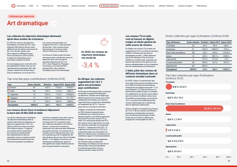 Page titleStandfirstBodyArt dramatiqueEn 2024, les revenus du r%u00e9pertoire dramatique ont recul%u00e9 de -3,4 %Les collectes du r%u00e9pertoire dramatique diminuent apr%u00e8s deux ann%u00e9es de croissanceLes revenus direct (live) et ambiance d%u00e9passent la barre des 50 Mio EUR en ItalieLes revenus du num%u00e9rique ont progress%u00e9 de 23,6 %, mais partaient de tr%u00e8s bas. C%u2019est la seule source de revenus en croissance entre 2023 et 2024 pour ce r%u00e9pertoire.La France et l%u2019Italie restent les deux principaux pays contributeurs pour ce r%u00e9pertoire avec une croissance annuelle respective de 3,2 % et 5,9 %. Avec l%u2019Argentine, l%u2019Espagne et la Suisse, ces cinq march%u00e9s g%u00e9n%u00e8rent 85 % des collectes mondiales li%u00e9es %u00e0 l%u2019art dramatique.La France enregistre aussi des revenus %u00e9lev%u00e9s pour les repr%u00e9sentations live, en hausse de 3,2 %, portant le total des collectes nationales %u00e0 69 millions d%u2019euros. La plus forte croissance, n%u00e9anmoins, est observ%u00e9e dans diff%u00e9rents plus petits march%u00e9s. Les revenus de la Lituanie sont en hausse d%u2019un tiers, ceux du Luxembourg et de l%u2019Ouzb%u00e9kistan de pr%u00e8s de deux tiers et ceux de la Colombie de 86,1 %. En Alg%u00e9rie, les revenus ont %u00e9t%u00e9 presque multipli%u00e9s par quatre et t%u00e9moignent d%u2019un regain d%u2019enthousiasme pour les performances sc%u00e9niques.En 2024, les revenus du r%u00e9pertoire dramatique ont recul%u00e9 de 3,4 % pour atteindre 208 millions d%u2019euros mais affichent tout de m%u00eame une hausse de 8,6 % sur dix ans. Apr%u00e8s avoir %u00e9t%u00e9 le r%u00e9pertoire affichant la plus forte croissance en 2022 et 2023, le r%u00e9pertoire dramatique est le seul %u00e0 %u00eatre en d%u00e9clin en 2024.En toute logique pour une forme d%u2019art principalement vivante, ax%u00e9e sur les repr%u00e9sentations physiques, 88 % des revenus viennent du secteur direct (live) et ambiance, en recul de 2,8 %. Les droits collect%u00e9s pour l%u2019utilisation du r%u00e9pertoire dramatique dans le secteur direct (live) et ambiance en Italie ont augment%u00e9 de 10,8 % en 2024 et atteint le niveau record de 50,9 millions d%u2019euros. Il s%u2019agit de la troisi%u00e8me ann%u00e9e cons%u00e9cutive de croissance exceptionnelle des repr%u00e9sentations li%u00e9es au spectacle vivant, un secteur touch%u00e9 particuli%u00e8rement durement par les restrictions pendant la pand%u00e9mie.Type d%u2019utilisation Droits collect%u00e9s %u00c9volution Depuis 2015 Depuis 2020TV & Radio 20 -2,3 % -5,5 % +5,6 %Num%u00e9rique 0,1 +23,6 % +168,0 % -75,6 %Direct (live) & ambiance 182 -2,8 % +9,4 % +131,0 %Autres 1,2 -6,8 % +82,1 % +33,8 %Copie priv%u00e9e 4 -21,3 % +71,4 % -1,5 %Location/pr%u00eat public 0,5 -35,0 % +4,7 % -23,2 %Reproduction 0,0 -82,6 % - -Total g%u00e9n%u00e9ral 208 M %u20ac -3,4 % +8,6 % +100,9 %Droits collect%u00e9s par type d%u2019utilisation (millions EUR)Part des collectes par type d%u2019utilisation (millions EUR)0 % 20 % 40 % 60 % 80 % 100 %Num%u00e9riqueAutresLocation/pr%u00eat public TV & RadioDirect (live) & ambianceCopie priv%u00e9eReproduction9,4 % 20 M %u20ac0,0 % %u20ac0,1 M %u20ac0,6 % 1,2 M %u20ac1,9 % 4 M %u20ac0,2 % %u20ac0,5 M %u20ac0,0 % %u20ac0 M %u20ac87,8 % 182 M %u20acPays Droits collect%u00e9s %u00c9volution Depuis 2015 Depuis 2020France 69 +3,2 % +14,0 % +142,9 %Italie 68 +5,9 % +12,9 % +60,4 %Argentine 14 -51,8 % -11,0 % +1235,4 %Espagne 12 +13,1 % +23,5 % +111,5 %Suisse 12 +0,3 % +33,2 % +34,8 %Total g%u00e9n%u00e9ral 208 M %u20ac -3,4 % +8,6 % +100,9 %Top cinq des pays contributeurs (millions EUR)Collectes par r%u00e9pertoireEn Afrique, les collectes augmentent de 18,2 % gr%u00e2ce aux principaux pays contributeursSi l%u2019Europe et l%u2019Am%u00e9rique latine continuent de dominer le march%u00e9 mondial pour ce r%u00e9pertoire, l%u2019Afrique est la r%u00e9gion qui affiche la plus forte croissance en 2024. Initialement tr%u00e8s faibles, les collectes r%u00e9gionales li%u00e9es au r%u00e9pertoire dramatique ont augment%u00e9 de 18,2 %. Tous les pays sont en croissance sauf deux.L%u2019Alg%u00e9rie, troisi%u00e8me du classement en 2023, devient le premier pays contributeur du continent pour ce r%u00e9pertoire gr%u00e2ce %u00e0 une belle progression du secteur live et des revenus TV et radio, et %u00e0 une hausse de plus de 50 % des revenus de la copie priv%u00e9e. Au total, les collectes nationales ont augment%u00e9 de 56,0 %. L%u2019Afrique du Sud (+24,1 %) a d%u00e9tr%u00f4n%u00e9 la C%u00f4te d%u2019Ivoire (+13,0 %) %u00e0 la deuxi%u00e8me place du classement. Au Mali, les collectes pour ce r%u00e9pertoire ont doubl%u00e9 par rapport %u00e0 l%u2019ann%u00e9e pr%u00e9c%u00e9dente.Malgr%u00e9 ces hausses encourageantes, les collectes li%u00e9es au r%u00e9pertoire dramatique en Afrique sont loin d%u2019avoir retrouv%u00e9 leur niveau pr%u00e9-pand%u00e9mie et restent presque deux tiers en dessous de leur niveau de 2015.Les revenus TV et radio sont en hausse en Alg%u00e9rie malgr%u00e9 un d%u00e9clin g%u00e9n%u00e9ral de cette source de revenusEn Alg%u00e9rie, les revenus TV et radio ont augment%u00e9 de 27,5 % en 2024 et montrent l%u2019int%u00e9r%u00eat croissant pour les %u0153uvres dramatiques locales. L%u2019Office National des Droits d%u2019Auteur et Droits Voisins (ONDA), la soci%u00e9t%u00e9 locale, a d%u00e9clar%u00e9 une hausse des revenus d%u2019un demi pour les pi%u00e8ces radiophoniques et d%u2019un cinqui%u00e8me pour les transmissions %u00e0 la t%u00e9l%u00e9vision.L%u2019Italie, pilier des revenus de diffusion dramatique dans un contexte mondial contrast%u00e9En 2024, l%u2019Italie a concentr%u00e9 pr%u00e8s des trois quarts des revenus mondiaux issus de la diffusion d%u2019%u0153uvres dramatiques, enregistrant une l%u00e9g%u00e8re hausse de +1,2 % pour atteindre 14,7 millions d%u2019euros. La performance stable du pays a contribu%u00e9 %u00e0 la stabilisation du secteur, alors m%u0