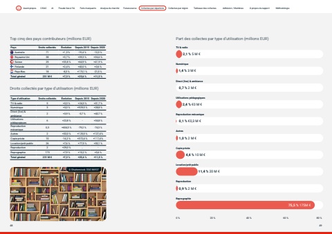 Page titleStandfirstBodyType d%u2019utilisation Droits collect%u00e9s %u00c9volution Depuis 2015 Depuis 2020TV & radio 5 +3,3 % +24,3 % +31,7 %Num%u00e9rique 3 +3,0 % +929,5 % +28,8 %Direct (live) & ambiance 2 +3,9 % -5,7 % +40,7 %Utilisations p%u00e9dagogiques 6 +22,8 % - +34,8 %Reproduction m%u00e9canique 0,3 +604,5 % -79,2 % -74,3 %Autres 2 +32,0 % +125,5 % +127,4 %Copie priv%u00e9e 10 -14,2 % +372,4 % +117,4 %Location/pr%u00eat public 26 +7,6 % +77,5 % +30,1 %Reproduction 2 +29,0 % - -Reprographie 175 +7,9 % +10,2 % +3,6 %Total g%u00e9n%u00e9ral 231 M %u20ac +7,3 % +25,6 % +11,5 %Droits collect%u00e9s par type d%u2019utilisation (millions EUR)%u00a9 Shutterstock 334186937 Part des collectes par type d%u2019utilisation (millions EUR)0 % 20 % 40 % 60 % 80 %TV & radioDirect (live) & ambianceReproduction m%u00e9caniqueCopie priv%u00e9eReproductionNum%u00e9riqueUtilisations p%u00e9dagogiquesAutresLocation/pr%u00eat public Reprographie2,1 % 5 M %u20ac1,4 % 3 M %u20ac0,7 % 2 M %u20ac2,4 % %u20ac0 M %u20ac0,1 % %u20ac0,3 M %u20ac1,0 % 2 M %u20ac4,4 % 10 M %u20ac11,4 % 20 M %u20ac0,9 % 2 M %u20ac75,5 % 175M %u20acPays Droits collect%u00e9s %u00c9volution Depuis 2015 Depuis 2020Australie 71 +1,3 % -19,4 % -12,3 %Royaume-Uni 38 +3,7 % +39,3 % +36,6 %Suisse 25 +33,8 % +64,9 % +41,9 %Finlande 21 +2,4 % +40,0 % +0,6 %Pays-Bas 18 -8,3 % +173,1 % -21,5 %Total g%u00e9n%u00e9ral 231 M %u20ac +7,3 % +25,6 % +11,5 %Top cinq des pays contributeurs (millions EUR)48 49Avant-propos CISAC AI Fraude li%u00e9e %u00e0 l%u2019IA Faits marquants Analyse du march%u00e9 Futuresource Collectes par r%u00e9pertoire Collectes par r%u00e9gion Tableaux des collectes Adh%u00e9sion / Membres %u00c0 propos du rapport M%u00e9thodologie