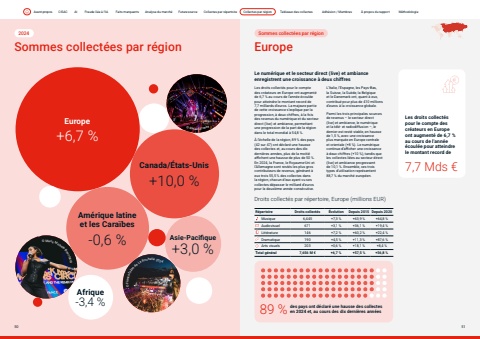 Page titleStandfirstBodySommes collect%u00e9es par r%u00e9gionSommes collect%u00e9es par r%u00e9gionEuropeLe num%u00e9rique et le secteur direct (live) et ambiance enregistrent une croissance %u00e0 deux chiffresLes droits collect%u00e9s pour le compte des cr%u00e9ateurs en Europe ont augment%u00e9 de 6,7 % au cours de l%u2019ann%u00e9e %u00e9coul%u00e9e pour atteindre le montant record de 7,7 Mds %u20ac R%u00e9pertoire Droits collect%u00e9s %u00c9volution Depuis 2015 Depuis 2020Musique 6,445 +7,3 % +63,9 % +64,8 %Audiovisuel 671 +3,1 % +36,1 % +19,4 %Litt%u00e9rature 146 +7,2 % +60,2 % +22,4 %Dramatique 190 +4,5 % +11,3 % +87,6 %Arts visuels 203 +0,6 % +18,1 % +8,4 %Total g%u00e9n%u00e9ral 7,656 M %u20ac +6,7 % +57,5 % +56,8 %Droits collect%u00e9s par r%u00e9pertoire, Europe (millions EUR)Les droits collect%u00e9s pour le compte des cr%u00e9ateurs en Europe ont augment%u00e9 de 6,7 % au cours de l%u2019ann%u00e9e %u00e9coul%u00e9e pour atteindre le montant record de 7,7 milliards d%u2019euros. La majeure partie de cette croissance s%u2019explique par la progression, %u00e0 deux chiffres, %u00e0 la fois des revenus du num%u00e9rique et du secteur direct (live) et ambiance, permettant une progression de la part de la r%u00e9gion dans le total mondial %u00e0 54,8 %. %u00c0 l%u2019%u00e9chelle de la r%u00e9gion, 89 % des pays (42 sur 47) ont d%u00e9clar%u00e9 une hausse des collectes et, au cours des dix derni%u00e8res ann%u00e9es, plus de la moiti%u00e9 affichent une hausse de plus de 50 %. En 2024, la France, le Royaume-Uni et l%u2019Allemagne sont rest%u00e9s les plus gros contributeurs de revenus, g%u00e9n%u00e9rant %u00e0 eux trois 55,5 % des collectes dans la r%u00e9gion, chacun d%u2019eux ayant vu ses collectes d%u00e9passer le milliard d%u2019euros pour la deuxi%u00e8me ann%u00e9e cons%u00e9cutive. L%u2019Italie, l%u2019Espagne, les Pays-Bas, la Suisse, la Su%u00e8de, la Belgique et le Danemark ont, quant %u00e0 eux, contribu%u00e9 pour plus de 410 millions d%u2019euros %u00e0 la croissance globale.Parmi les trois principales sources de revenus %u2013 le secteur direct (live) et ambiance, le num%u00e9rique et la t%u00e9l%u00e9- et radiodiffusion %u2013, le dernier est rest%u00e9 stable, en hausse de 1,5 %, avec une croissance plus marqu%u00e9e en Europe centrale et orientale (+8 %). Le num%u00e9rique continue d%u2019afficher une croissance %u00e0 deux chiffres (+10 %), tandis que les collectes li%u00e9es au secteur direct (live) et ambiance progressent de 10,1 %. Ensemble, ces trois types d%u2019utilisation repr%u00e9sentent 88,7 % du march%u00e9 europ%u00e9en.des pays ont d%u00e9clar%u00e9 une hausse des collectes 89 % en 2024 et, au cours des dix derni%u00e8res ann%u00e9esEurope+6,7 %Canada/%u00c9tats-Unis+10,0 %Am%u00e9rique latine et les Cara%u00efbes-0,6 %Afrique-3,4 %Asie-Pacifique+3,0 %2024%u00a9 Rafael Aroeira%u00a9 Marie Michele Bouchard%u00a9 Francofolies de La Rochelle 202450 51Avant-propos CISAC AI Fraude li%u00e9e %u00e0 l%u2019IA Faits marquants Analyse du march%u00e9 Futuresource Collectes par r%u00e9pertoire Collectes par r%u00e9gion Tableaux des collectes Adh%u00e9sion / Membres %u00c0 propos du rapport M%u00e9thodologie