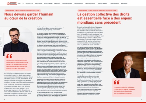 Page titleStandfirstBodyNous devons garder l%u2019humain au c%u0153ur de la cr%u00e9ation La gestion collective des droits est essentielle face %u00e0 des enjeux mondiaux sans pr%u00e9c%u00e9dent En 2024, les soci%u00e9t%u00e9s d%u2019auteurs ont r%u00e9parti un montant record de droits aux cr%u00e9ateurs du monde entier. Nous pouvons nous r%u00e9jouir de ce r%u00e9sultat qui montre la r%u00e9silience de la gestion collective et la valeur des %u0153uvres cr%u00e9atives dans un march%u00e9 en pleine expansion. D%u2019un autre c%u00f4t%u00e9, l%u2019arriv%u00e9e de l%u2019intelligence artificielle marque le d%u00e9but d%u2019un profond changement pour notre secteur %u2013 une preuve que le progr%u00e8s et la disruption ne sont pas incompatibles et que l%u2019avenir de la cr%u00e9ativit%u00e9 d%u00e9pendra de la fa%u00e7on dont nous pouvons concilier ces deux r%u00e9alit%u00e9s. En cette p%u00e9riode d%u2019%u00e9volution fulgurante de l%u2019IA et de num%u00e9risation plan%u00e9taire, les cr%u00e9ateurs font face %u00e0 des d%u00e9fis sans pr%u00e9c%u00e9dent, non seulement dans la fa%u00e7on dont ils travaillent mais aussi pour leur garantir une r%u00e9mun%u00e9ration ad%u00e9quate pour une activit%u00e9 qui enrichit notre monde de mani%u00e8re incommensurable. Le r%u00f4le des soci%u00e9t%u00e9s de gestion collective et de notre coalition mondiale d%u2019ayants droit n%u2019a jamais %u00e9t%u00e9 aussi essentiel. Une gestion collective unifi%u00e9e est ce qui permet qu%u2019une chanson, un film, un livre ou une %u0153uvre d%u2019art g%u00e9n%u00e8re des revenus en tout point du globe. C%u2019est ce qui garantit que les cr%u00e9ateurs profitent d%u00fbment du succ%u00e8s de toute avanc%u00e9e technologique reposant sur leur travail. C%u2019est ce qui prot%u00e8ge les cr%u00e9ateurs contre la disruption num%u00e9rique, l%u2019%u00e9volution des habitudes de consommation et le d%u00e9fi existentiel de l%u2019IA. Nos soci%u00e9t%u00e9s membres restent un partenaire ind%u00e9fectible, un partenaire de confiance, pour les cr%u00e9ateurs du monde entier : elles %u00e9voluent, innovent, n%u00e9gocient et s%u2019adaptent sans cesse pour prot%u00e9ger leurs droits et faire entendre leurs voix par-del%u00e0 les fronti%u00e8res. Elles offrent des syst%u00e8mes %u00e9volutifs d%u2019octroi de licences, de r%u00e9partition des droits et de donn%u00e9es qui ont fait leurs preuves, et misent sans cesse sur de nouvelles innovations. CIS-NET 2,0, par exemple, garantira que les cr%u00e9ateurs sont pay%u00e9s plus rapidement et plus efficacement que jamais. Alors que j%u2019entame mon premier mandat %u00e0 la Pr%u00e9sidence du conseil d%u2019administration de la CISAC, ma priorit%u00e9 est claire : me battre pour prot%u00e9ger les cr%u00e9ateurs, car leur protection est le fondement culturel, social et %u00e9conomique de toute nation. Chaque pays a la responsabilit%u00e9 de veiller au bien-%u00eatre de ses acteurs culturels gr%u00e2ce %u00e0 un solide cadre de protection du droit d%u2019auteur, et de garantir aux cr%u00e9ateurs une part de la valeur g%u00e9n%u00e9r%u00e9e par des innovations telle que l%u2019IA g%u00e9n%u00e9rative. Notre solidarit%u00e9 entre soci%u00e9t%u00e9s sera d%u00e9terminante pour garantir que les cr%u00e9ateurs continuent d%u2019%u00eatre reconnus et r%u00e9mun%u00e9r%u00e9s pour leur travail essentiel. C%u2019est une bataille que nous sommes d%u00e9termin%u00e9s %u00e0 mener, aujourd%u2019hui et %u00e0 l%u2019avenir. Le plus inqui%u00e9tant pour la communaut%u00e9 des cr%u00e9ateurs, c%u2019est que l%u2019IA est capable d%u2019absorber des contenus cr%u00e9atifs et de les resservir sans aucun contr%u00f4le ni r%u00e9mun%u00e9ration des auteurs humains. Je vois cette r%u00e9volution technologique comme quelqu%u2019un qui utilise lui-m%u00eame les outils d%u2019IA. Je suis conscient de leur potentiel. %u00c0 mes yeux, ces outils peuvent jouer le r%u00f4le d%u2019un auteurcompositeur de plus dans la pi%u00e8ce, proposant des id%u00e9es qui enrichissent et compl%u00e8tent le processus de cr%u00e9ation humain. Mais je vois aussi que, quand les op%u00e9rateurs d%u2019IA %u00e9difient de vastes mod%u00e8les en utilisant les %u0153uvres de millions de cr%u00e9ateurs sans autorisation, l%u2019effet est tr%u00e8s diff%u00e9rent. Ce qui n%u2019%u00e9tait au d%u00e9part qu%u2019un simple outil devient un instrument d%u2019exploitation syst%u00e9matique. En l%u2019absence de contr%u00f4les et de garde-fous, l%u2019IA soul%u00e8ve de profondes questions sur la paternit%u00e9 des %u0153uvres et leur valeur. Les chiffres sont parlants. Une %u00e9tude command%u00e9e par la CISAC et un certain nombre d%u2019%u00e9tudes du m%u00eame type r%u00e9alis%u00e9es par ses soci%u00e9t%u00e9s membres dans diff%u00e9rents pays ont montr%u00e9 que les cr%u00e9ateurs pourraient %u00eatre priv%u00e9s de pr%u00e8s d%u2019un quart de leurs droits d%u2019auteur si l%u2019utilisation de l%u2019IA reste non encadr%u00e9e, en dehors de toute autorisation. Pendant ce temps, le march%u00e9 des contenus g%u00e9n%u00e9r%u00e9s par l%u2019IA devrait se d%u00e9velopper de mani%u00e8re significative et atteindre 64 milliards d%u2019euros dans trois ans %u00e0 peine. Il s%u2019agit d%u2019une immense perte de valeur pour les personnes qui donnent %u00e0 la culture tout son sens. Lors de mes r%u00e9centes interventions publiques, %u00e0 Bruxelles, au Royaume-Uni et ailleurs, j%u2019ai souvent instamment demand%u00e9 que les cr%u00e9ateurs soient int%u00e9gr%u00e9s dans les d%u00e9cisions et pas seulement en marge %u00e0 regarder ce qui se passe. J%u2019ai aussi soulign%u00e9 que, si les cr%u00e9ateurs sont exclus des d%u00e9cisions, les entreprises de technologie auront le champ libre pour prendre possession d%u2019une valeur qui appartient de droit %u00e0 l%u2019humanit%u00e9. J%u2019ai rencontr%u00e9 des d%u00e9cideurs politiques qui m%u2019ont %u00e9cout%u00e9 mais maintenant, nous avons besoin de soutiens politiques qui 