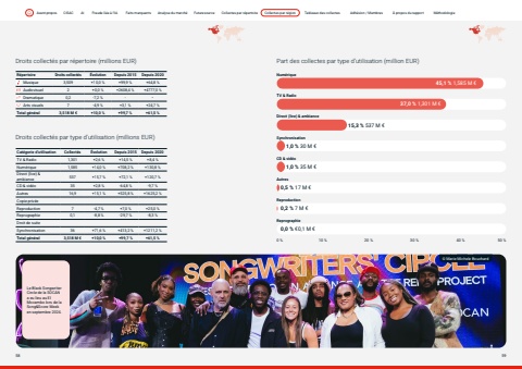 Page titleStandfirstBodyR%u00e9pertoire Droits collect%u00e9s %u00c9volution Depuis 2015 Depuis 2020Musique 3,509 +10,0 % +99,9 % +64,8 %Audiovisuel 2 +0,0 % +2608,4 % +4777,0 %Dramatique 0,2 -7,2 % - -Arts visuels 7 -4,9 % +3,1 % +24,7 %Total g%u00e9n%u00e9ral 3,518 M %u20ac +10,0 % +99,7 % +61,5 %Droits collect%u00e9s par r%u00e9pertoire (millions EUR)Cat%u00e9gorie d%u2019utilisation Collect%u00e9s %u00c9volution Depuis 2015 Depuis 2020TV & Radio 1,301 +2,6 % +14,5 % +8,4 %Num%u00e9rique 1,585 +14,0 % +708,2 % +130,8 %Direct (live) & ambiance 537 +15,7 % +72,1 % +120,7 %CD & vid%u00e9o 35 +2,8 % -64,8 % -9,7 %Autres 16,9 +15,1 % +525,8 % +1625,2 %Copie priv%u00e9eReproduction 7 -4,7 % +7,0 % +25,0 %Reprographie 0,1 -8,8 % -29,7 % -8,3 %Droit de suiteSynchronisation 36 +71,6 % +413,2 % +1211,2 %Total g%u00e9n%u00e9ral 3,518 M %u20ac +10,0 % +99,7 % +61,5 %Droits collect%u00e9s par type d%u2019utilisation (millions EUR)Part des collectes par type d%u2019utilisation (million EUR)0 % 10 % 20 % 30 % 40 % 50 %Num%u00e9riqueDirect (live) & ambianceCD & vid%u00e9oReproductionReprographieTV & RadioSynchronisationAutres45,1 % 1,585 M %u20ac37,0 % 1,301 M %u20ac15,3 % 537 M %u20ac1,0 % 30 M %u20ac1,0 % 35 M %u20ac0,5 % 17 M %u20ac0,2 % 7 M %u20ac0,0 % %u20ac0,1 M %u20ac%u00a9 Marie Michele BouchardLe Black Songwriter Circle de la SOCAN a eu lieu au El Mocambo lors de la Song&Score Week en septembre 2024.58 59Avant-propos CISAC AI Fraude li%u00e9e %u00e0 l%u2019IA Faits marquants Analyse du march%u00e9 Futuresource Collectes par r%u00e9pertoire Collectes par r%u00e9gion Tableaux des collectes Adh%u00e9sion / Membres %u00c0 propos du rapport M%u00e9thodologie