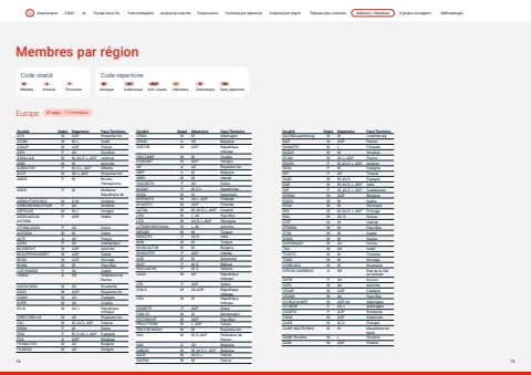 Page titleStandfirstBody47 pays - 113 membresMembres par r%u00e9gionCode statutM A PMembre Associ%u00e9 ProvisoireCode r%u00e9pertoireM AV AGP L D SRMusique Audiovisuel Arts visuels Litt%u00e9rature Dramatique Sans r%u00e9pertoireSoci%u00e9t%u00e9 Statut R%u00e9pertoire Pays/TerritoireACS M AGP Royaume-UniACUM M M, L Isra%u00eblADAGP M AGP FranceAIPA P AV Slov%u00e9nieAKKA-LAA M M, AV, D, L, AGP LettonieAKM M M AutricheALBAUTOR P M, D, L, AGP AlbanieALCS M AV, L, AGP Royaume-UniAMUS P M BosnieHerz%u00e9govineANCO P M Moldavie, R%u00e9publique deARMAUTHOR NGO M D, M Arm%u00e9nieARMCINEMAAUTHOR P AV Arm%u00e9nieARTISJUS M M, L HongrieASOCIJACIJA AUTORAP AGP SerbieATHINA-SADA P AV Gr%u00e8ceAUTODIA M M Gr%u00e8ceAVTE A AV FranceAZDG P AV Azerba%u00efdjanBILDRECHT M AGP AutricheBILDUPPHOVSR%u00c4TT M AGP Su%u00e8deBONO M AGP Norv%u00e8geBUMA M M Pays-BasCOPYSWEDE P AV Su%u00e8deCRSEA A SR F%u00e9d%u00e9ration de RussieDACIN SARA M AV RoumanieDACS M AGP Royaume-UniDAMA M AV EspagneDHFR M AV CroatieDILIA M AV, L R%u00e9publique tch%u00e8queDIRECTORS UK M AV Royaume-UniEAU M M, AV, D, AGP EstonieEDEM P M Gr%u00e8ceEKKI P M, D, AV, L, AGP EspagneEVA A AGP BelgiqueFILMAUTOR M AV BulgarieFILMJUS M AV HongrieSoci%u00e9t%u00e9 Statut R%u00e9pertoire Pays/TerritoireGEMA M M AllemagneGESAC A SR BelgiqueGESTOR M AGP R%u00e9publique tch%u00e8queHDS-ZAMP M M CroatieHUNGART M AGP HongrieIAF A AV Royaume-UniIMPF A M BelgiqueIMRO M M IrlandeISOCRATIS P AV Gr%u00e8ceKAZAK P M, D, L KazakhstanKODA M M DanemarkKOPIOSTO M AV, L, AGP FinlandeKUVASTO M AGP FinlandeLATGA M M, AV, D, L, AGP LituanieLIRA M L, AV Pays-BasLITA M AV, D, L, AGP SlovaquieLITERAR-MECHANA M L, AV AutricheMESAM M M TurquieMRIGHTS P AV, D ItalieMSG M M TurquieMUSICAUTOR M M BulgarieMYNDSTEF P AGP IslandeNCB M M DanemarkNCIP P M, D B%u00e9larusNGO-UACRR P M, D UkraineOAZA M AV R%u00e9publique tch%u00e8queOFA P AGP SerbieOOA-S M AV, AGP R%u00e9publique tch%u00e8queOSA M M R%u00e9publique tch%u00e8queOSDEETE P AGP Gr%u00e8cePAM CG M M Mont%u00e9n%u00e9groPICTORIGHT M AGP Pays-BasPROLITTERIS M L, AGP SuissePRS FOR MUSIC M M Royaume-UniRAO M M, D, AGP F%u00e9d%u00e9ration de RussieSAA A AV BelgiqueSABAM M M, AV, D, L, AGP BelgiqueSACD M AV, D, L FranceSACEM M M FranceSoci%u00e9t%u00e9 Statut R%u00e9pertoire Pays/TerritoireSACEMLuxembourg M M LuxembourgSAIF M AGP FranceSANASTO M L FinlandeSAZAS M M Slov%u00e9nieSCAM M AV, L, AGP FranceSDADV P M, AV, D, L, AGP AndorreSEDA P M EspagneSEF P AV TurquieSGAE M M, AV, D EspagneSIAE M M, AV, D, L, AGP ItalieSIIP P M, AV, D, L, AGP Ouzb%u00e9kistanSOFAM M AGP BelgiqueSOKOJ M M SerbieSOZA M M SlovaquieSPA M M, AV, D, L, AGP PortugalSSA M AV, D SuisseSTEF M M IslandeSTEMRA M M Pays-BasSTIM M M Su%u00e8deSUISA M M SuisseSUISSIMAGE M AV SuisseTALI M AV Isra%u00eblTEOSTO M M FinlandeTONO M M Norv%u00e8geUCMR-ADA M M RoumanieUFFICIO GIURIDICO A SR %u00c9tat de la Cit%u00e9 du VaticanVAPIK P AV KosovoVDFS M AV AutricheVEGAP M AGP EspagneVEVAM M AV Pays-BasVG BILD-KUNST M AGP, AV AllemagneVG WORT P AV, L AllemagneVISARTA P AGP RoumanieVISDA M AGP DanemarkZAIKS M M, D PologneZAMP MACEDONIA M M Mac%u00e9doine du NordZAMP Slov%u00e9nie M L Slov%u00e9nieZAPA M ADP PolandEurope74 75Avant-propos CISAC AI Fraude li%u00e9e %u00e0 l%u2019IA Faits marquants Analyse du march%u00e9 Futuresource Collectes par r%u00e9pertoire Collectes par r%u00e9gion Tableaux des collectes Adh%u00e9sion / Membres %u00c0 propos du rapport M%u00e9thodologie