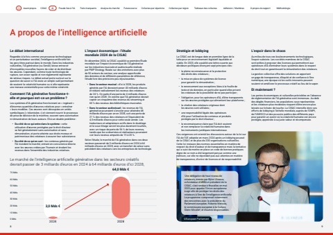 Page titleStandfirstBodyLe d%u00e9bat international Regard%u00e9e %u00e0 la fois comme une prouesse technologique et un perturbateur soci%u00e9tal, l%u2019intelligence artificielle fait les gros titres partout dans le monde. Dans les industries culturelles, l%u2019IA g%u00e9n%u00e9rative (ou GenAI) laisse entrevoir d%u2019incroyables nouvelles fa%u00e7ons de cr%u00e9er et de distribuer les %u0153uvres. Cependant, comme toute technologie de rupture, son essor rapide et non r%u00e9glement%u00e9 repr%u00e9sente de s%u00e9rieux risques. Le d%u00e9bat actuel porte surtout sur la question de savoir si l%u2019IA reste un simple outil permettant de soutenir la cr%u00e9ativit%u00e9 humaine ou si elle repr%u00e9sente une menace existentielle pour cette m%u00eame cr%u00e9ativit%u00e9. Comment l%u2019IA g%u00e9n%u00e9rative fonctionne-telle et pourquoi est-ce un probl%u00e8me ? Les syst%u00e8mes d%u2019IA g%u00e9n%u00e9rative fonctionnent en %u00ab ing%u00e9rant %u00bb d%u2019%u00e9normes quantit%u00e9s d%u2019%u0153uvres cr%u00e9atives pour %u00ab entra%u00eener %u00bb leurs mod%u00e8les. Ces %u0153uvres sont d%u00e9coup%u00e9es en unit%u00e9s symboliques (%u00ab tokenis%u00e9es %u00bb) et viennent nourrir le processus de prise de d%u00e9cision de la machine, souvent sans autorisation ni r%u00e9mun%u00e9ration de leurs auteurs. D%u2019o%u00f9 un double probl%u00e8me : %u2022 Du c%u00f4t%u00e9 de ce qui entre dans le syst%u00e8me : cette utilisation d%u2019%u0153uvres prot%u00e9g%u00e9es par le droit d%u2019auteur se fait g%u00e9n%u00e9ralement sans autorisation et sans r%u00e9mun%u00e9ration, et porte atteinte aux droits moraux et patrimoniaux des cr%u00e9ateurs %u00e0 assurer leur subsistance.%u2022 Du c%u00f4t%u00e9 de ce qui en sort : les contenus g%u00e9n%u00e9r%u00e9s par l%u2019IA inondent le march%u00e9, entrant en concurrence directe avec les %u0153uvres cr%u00e9%u00e9es par l%u2019humain et %u00e9rodant les revenus dans l%u2019ensemble des industries cr%u00e9atives. L%u2019impact %u00e9conomique : l%u2019%u00e9tude mondiale 2024 de la CISAC En d%u00e9cembre 2024, la CISAC a publi%u00e9 sa premi%u00e8re %u00c9tude mondiale sur l%u2019impact %u00e9conomique de l%u2019IA g%u00e9n%u00e9rative sur les industries musicale et audiovisuelle r%u00e9alis%u00e9e par PMP Strategy. Bas%u00e9e sur des entretiens avec plus de 50 acteurs du secteur, une analyse approfondie des donn%u00e9es et de diff%u00e9rents param%u00e8tres de r%u00e9f%u00e9rence, l%u2019%u00e9tude livre des pr%u00e9visions peu r%u00e9jouissantes : %u2022 Dans le secteur musical : d%u2019ici %u00e0 2028, les produits g%u00e9n%u00e9r%u00e9s par l%u2019IA devraient peser 40 milliards d%u2019euros et r%u00e9duire radicalement les revenus des cr%u00e9ateurs de 24 %. On parle d%u2019une perte de 4 milliards d%u2019euros rien qu%u2019en 2028. On estime que l%u2019IA g%u00e9n%u00e9rative devrait capter un cinqui%u00e8me des revenus du streaming et 60 % des revenus des biblioth%u00e8ques musicales. %u2022 Dans le secteur audiovisuel : les revenus de l%u2019IA g%u00e9n%u00e9rative pourraient s%u2019envoler pour atteindre 48 milliards d%u2019euros par an en 2028, soit une perte de 21 % des revenus des cr%u00e9ateurs et l%u2019%u00e9quivalent de 4,5 milliards d%u2019euros pour cette seule ann%u00e9e. Les traducteurs et adaptateurs actifs dans le doublage et le sous-titrage seront les plus durement touch%u00e9s, avec un risque de perte de 56 % de leurs revenus, tandis que les sc%u00e9naristes et r%u00e9alisateurs pourraient voir leurs revenus amput%u00e9s de 15 %u00e0 20 %. Selon l%u2019%u00e9tude, le march%u00e9 de l%u2019IA g%u00e9n%u00e9rative dans ces deux secteurs passerait de 3 milliards d%u2019euros en 2024 %u00e0 64 milliards d%u2019euros en 2028, avec un transfert de valeur sans pr%u00e9c%u00e9dent des cr%u00e9ateurs vers les entreprises de technologie. L%u2019espoir dans le chaos Au milieu de tous ces bouleversements technologiques, l%u2019espoir subsiste. Les soci%u00e9t%u00e9s membres de la CISAC sont pr%u00eates %u00e0 proposer des licences qui permettront aux op%u00e9rateurs d%u2019IA d%u2019entra%u00eener leurs syst%u00e8mes dans le respect du droit tout en garantissant la r%u00e9mun%u00e9ration des cr%u00e9ateurs. La gestion collective offre des solutions en apportant un gage de transparence, d%u2019%u00e9quit%u00e9 et de confiance %u00e0 l%u2019%u00e8re num%u00e9rique, une %u00e9poque o%u00f9 les outils innovants peuvent soutenir et am%u00e9liorer le processus cr%u00e9atif au lieu de le saper. Et maintenant ? Les pertes %u00e9conomiques et culturelles pr%u00e9visibles en l%u2019absence de r%u00e9glementation de l%u2019IA g%u00e9n%u00e9rative sont immenses. Au-del%u00e0 des d%u00e9g%u00e2ts financiers, les populations sous-repr%u00e9sent%u00e9es et les cr%u00e9ateurs plus modestes risquent d%u2019%u00eatre encore plus laiss%u00e9s sur le banc de touche. La CISAC intensifie donc ses efforts de lobbying %u00e0 l%u2019%u00e9chelle mondiale, aupr%u00e8s de l%u2019OMPI, de l%u2019UNESCO et des pouvoirs publics des diff%u00e9rents pays pour garantir un avenir o%u00f9 la cr%u00e9ativit%u00e9 humaine est encore prot%u00e9g%u00e9e, appr%u00e9ci%u00e9e %u00e0 sa juste valeur et r%u00e9compens%u00e9e. Strat%u00e9gie et lobbying La CISAC est de longue date en premi%u00e8re ligne de la lutte pour un environnement l%u00e9gislatif %u00e9quitable et viable. En 2023, elle a publi%u00e9 une lettre ouverte aux d%u00e9cideurs politiques %u00e9non%u00e7ant sept principes cl%u00e9s : %u2022 la pleine reconnaissance et la protection des droits des cr%u00e9ateurs ; %u2022 la mise en place de syst%u00e8mes de licence pour garantir la r%u00e9mun%u00e9ration ; %u2022 le renoncement aux exceptions li%u00e9es %u00e0 la fouille de texte et de donn%u00e9es, en particulier quand elles privent les cr%u00e9ateurs de la possibilit%u00e9 de ne pas participer ; %u2022 l%u2019obligation, pour les op%u00e9rateurs d%u2019IA, d%u2019%u00eatre transparents sur les %u0153uv