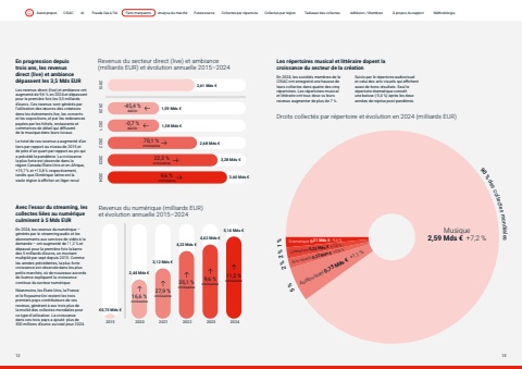 Page titleStandfirstBodyEn progression depuis trois ans, les revenus direct (live) et ambiance d%u00e9passent les 3,5 Mds EUR Les revenus direct (live) et ambiance ont augment%u00e9 de 9,6 % en 2024 et d%u00e9passent pour la premi%u00e8re fois les 3,5 milliards d%u2019euros. Ces revenus sont g%u00e9n%u00e9r%u00e9s par l%u2019utilisation des %u0153uvres des cr%u00e9ateurs dans les %u00e9v%u00e9nements live, les concerts et les expositions, et par les redevances pay%u00e9es par les h%u00f4tels, restaurants et commerces de d%u00e9tail qui diffusent de la musique dans leurs locaux. Le total de ces revenus a augment%u00e9 d%u2019un tiers par rapport au niveau de 2015 et de pr%u00e8s d%u2019un quart par rapport au pic qui a pr%u00e9c%u00e9d%u00e9 la pand%u00e9mie. La croissance la plus forte est observ%u00e9e dans la r%u00e9gion Canada/%u00c9tats-Unis et en Afrique, +15,7 % et +13,8 % respectivement, tandis que l%u2019Am%u00e9rique latine est la seule r%u00e9gion %u00e0 afficher un l%u00e9ger recul. Avec l%u2019essor du streaming, les collectes li%u00e9es au num%u00e9rique culminent %u00e0 5 Mds EUR En 2024, les revenus du num%u00e9rique %u2013 g%u00e9n%u00e9r%u00e9s par le streaming audio et les abonnements aux services de vid%u00e9o %u00e0 la demande %u2013 ont augment%u00e9 de 11,2 % et d%u00e9pass%u00e9 pour la premi%u00e8re fois la barre des 5 milliards d%u2019euros, un montant multipli%u00e9 par sept depuis 2015. Comme les ann%u00e9es pr%u00e9c%u00e9dentes, la plus forte croissance est observ%u00e9e dans les plus petits march%u00e9s, o%u00f9 de nouveaux accords de licence expliquent la croissance continue du secteur num%u00e9rique. N%u00e9anmoins, les %u00c9tats-Unis, la France et le Royaume-Uni restent les trois premiers pays contributeurs de ces revenus, g%u00e9n%u00e9rant %u00e0 eux trois plus de la moiti%u00e9 des collectes mondiales pour ce type d%u2019utilisation. La croissance dans ces trois pays a ajout%u00e9 plus de 300 millions d%u2019euros au total pour 2024. Les r%u00e9pertoires musical et litt%u00e9raire dopent la croissance du secteur de la cr%u00e9ation 2015 2020 2022 2021 2023 2024Revenus du secteur direct (live) et ambiance (milliards EUR) et %u00e9volution annuelle 2015%u20132024 Droits collect%u00e9s par r%u00e9pertoire et %u00e9volution en 2024 (milliards EUR) 3,60 Mds %u20ac3,28 Mds %u20ac2,68 Mds %u20ac1,58 Mds %u20ac1,59 Mds %u20ac2,61 Mds %u20ac-45,4 %d%u00e9clin 70,1 %croissance-0,7 %d%u00e9clin 22,2 %croissance9,6 %croissance2015 2020 2021 2022 2023 2024%u20ac0,73 Mds %u20ac3,12 Mds %u20ac4,62 Mds %u20ac2,44 Mds %u20ac4,22 Mds %u20ac5,14 Mds %u20ac16,6 %croissance35,1 %croissance27,9 %croissance9,6 %croissance11,2 %croissanceRevenus du num%u00e9rique (milliards EUR) et %u00e9volution annuelle 2015%u20132024 Musique2,59 Mds %u20ac +7,2 %Audiovisuel 0,73 Mds %u20ac +1,1 %Arts visuels 0,22 Mds %u20ac Litt%u00e9rature +0,9 %0,23 Mds %u20ac +7,3 %Dramatique 0,21 Mds %u20ac -3,4 %90 % descollectesmondiales1%2%2%5%En 2024, les soci%u00e9t%u00e9s membres de la CISAC ont enregistr%u00e9 une hausse de leurs collectes dans quatre des cinq r%u00e9pertoires. Les r%u00e9pertoires musical et litt%u00e9raire ont tous deux vu leurs revenus augmenter de plus de 7 %. Suivis par le r%u00e9pertoire audiovisuel et celui des arts visuels qui affichent aussi de bons r%u00e9sultats. Seul le r%u00e9pertoire dramatique conna%u00eet une baisse (-3,4 %) apr%u00e8s les deux ann%u00e9es de reprise post-pand%u00e9mie. 12 13Avant-propos CISAC AI Fraude li%u00e9e %u00e0 l%u2019IA Faits marquants Analyse du march%u00e9 Futuresource Collectes par r%u00e9pertoire Collectes par r%u00e9gion Tableaux des collectes Adh%u00e9sion / Membres %u00c0 propos du rapport M%u00e9thodologie